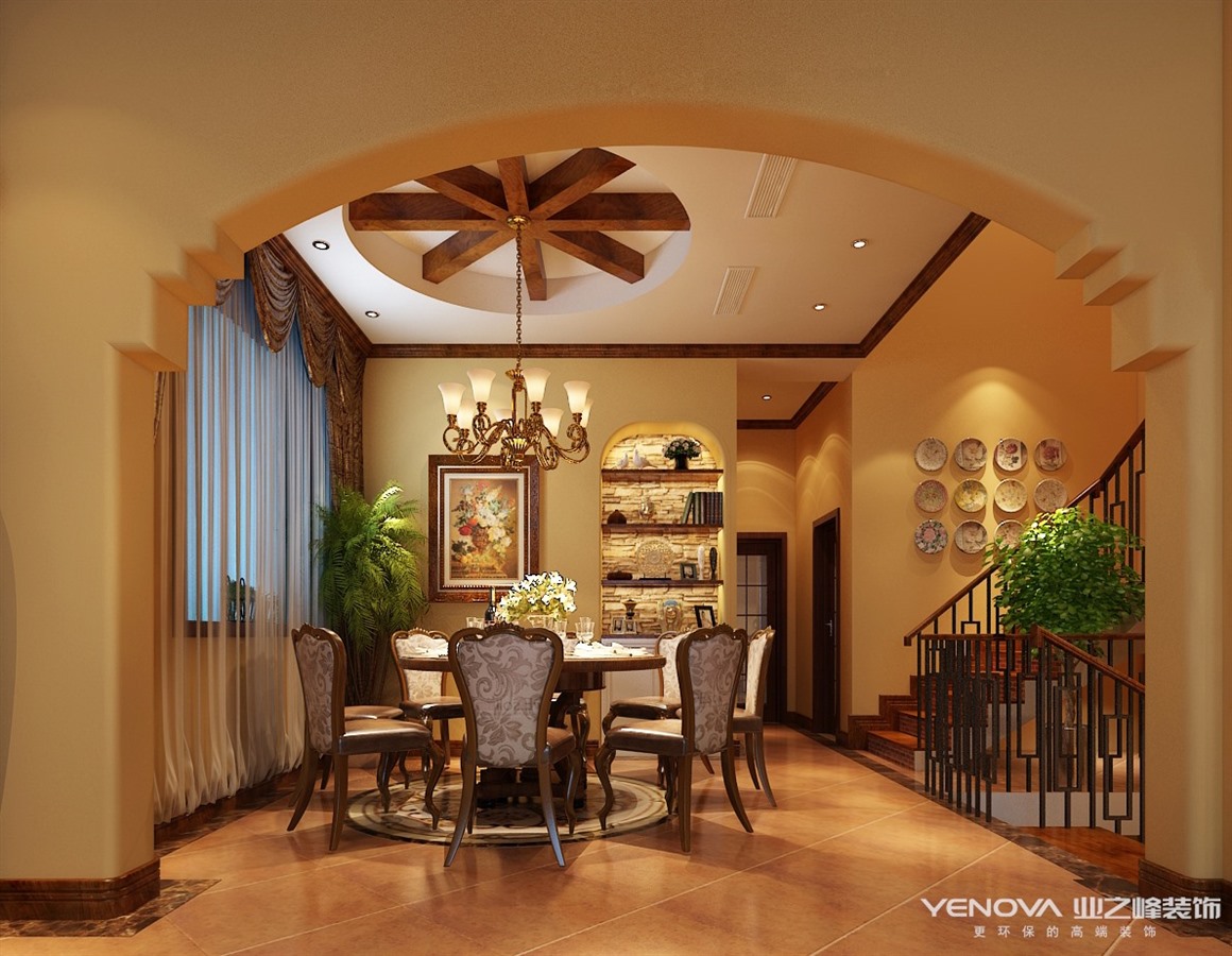 餐厅区域,在户型改造上并没有发生什么变化,主要是在后期的设计中借助老人房的空间做一个内嵌式的餐边柜,在上面放置不同的装饰品。吊顶运用了圆形加木梁的吊顶,与圆形的餐桌喝地面圆形的拼花相互呼应。