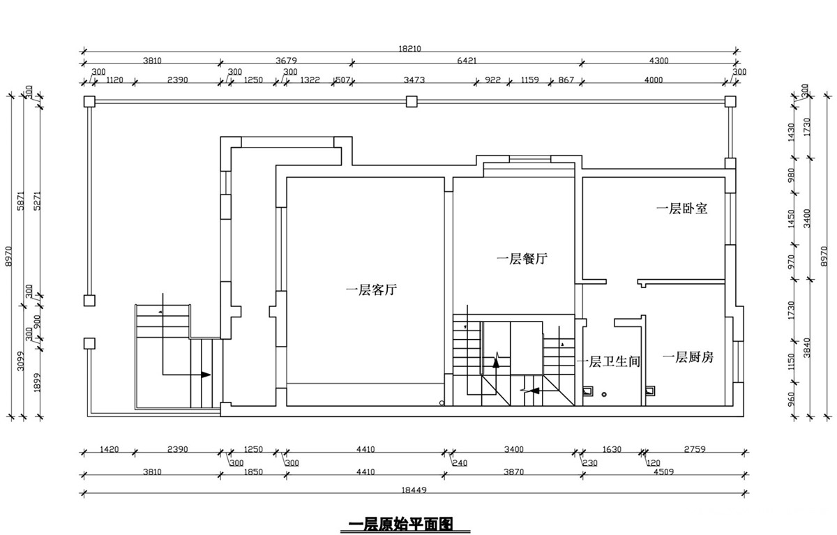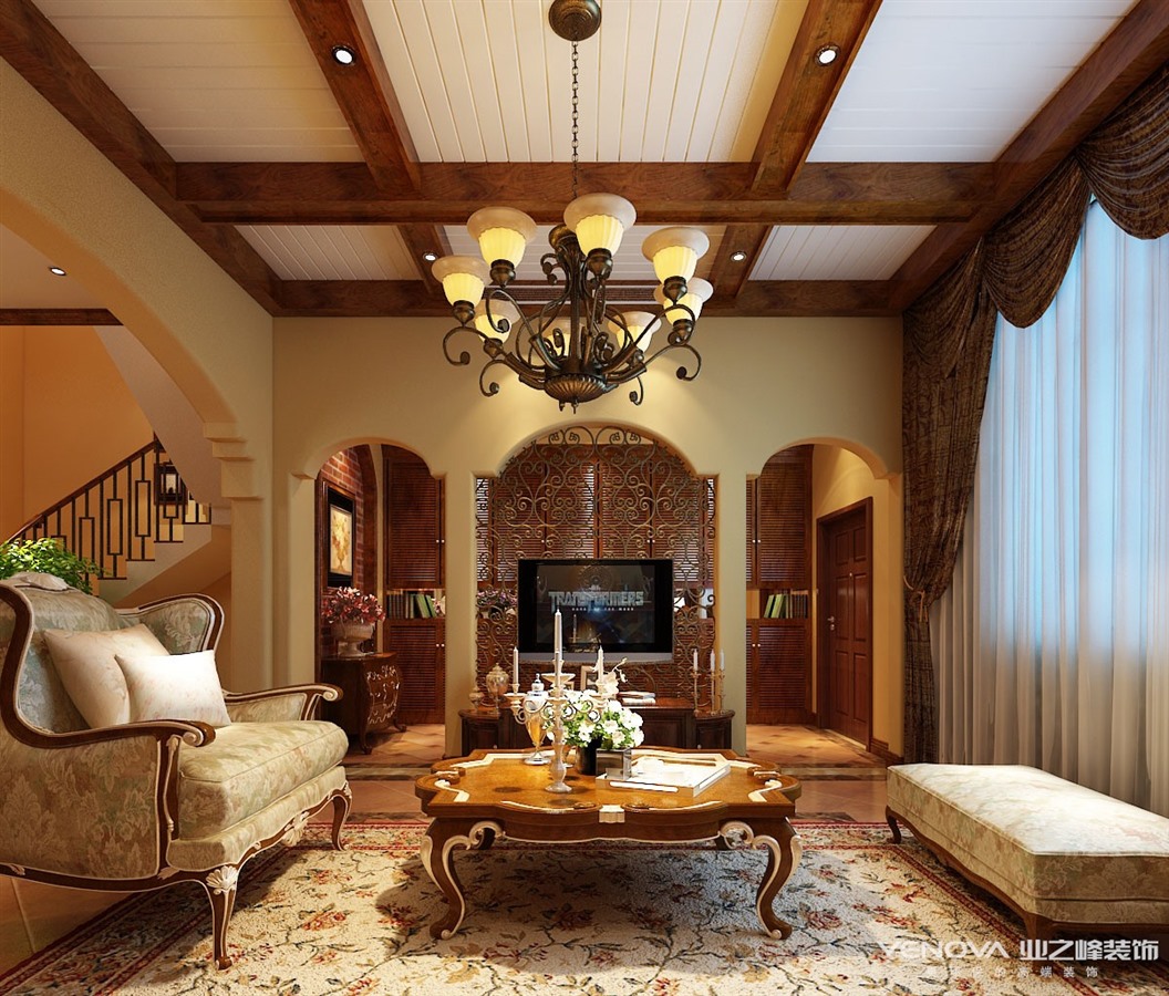 一层主要分为客厅、餐厅、厨房、老人房、卫生间。从原始户型上看,门厅的区域不大,没有单独放置鞋柜的区域,在后期的改造中,借助客厅的空间,利用美式经典的铁艺镂空隔断,将门厅与客厅完美的结合在一起,从门厅处看,客厅若影若现的呈现在眼前。门厅区域,地面材质上使用了仿古地砖加角花,吊顶上采用了弧形的造型,和木地板衬底,让整个门厅呈现出浓郁的复古气息。