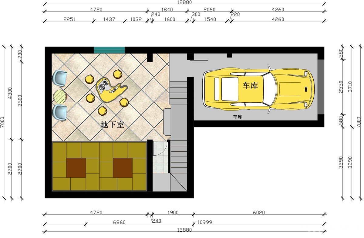 地下室的设计室内车库直接入户方便风雨天客户的出入,休闲区放置茶海和榻榻米,方便业主招待朋友,榻榻米作为客人临时的休息区,楼梯底下增加客户的储物空间