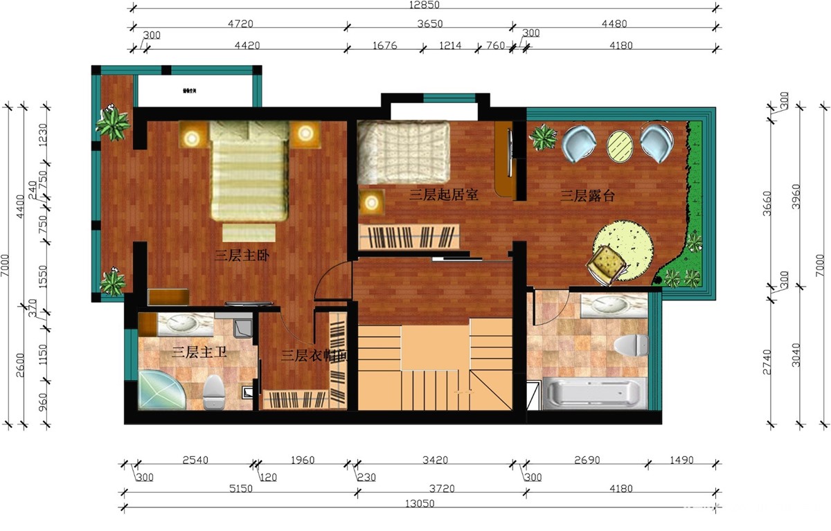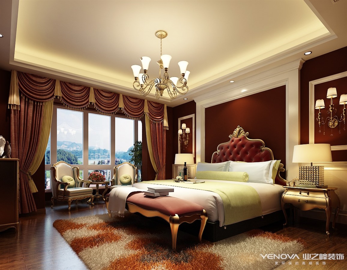 三层是作为两个20岁的姑娘的居中,一个卧室设计成暗红色,增加美式里面活跃的色彩,更符合女儿的年龄。另外利用小会客区,设计成房间,因外面积的限制,把外面的露台封成房间作为小女儿的活动休闲区域,和卫生间,增加空间的私密性。