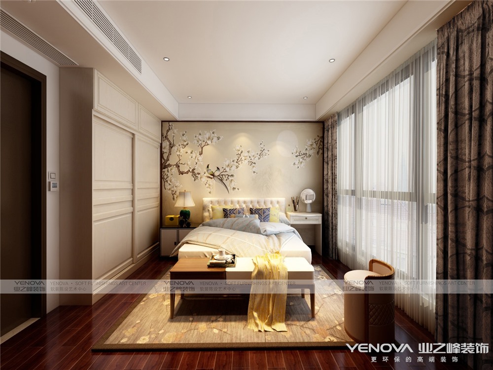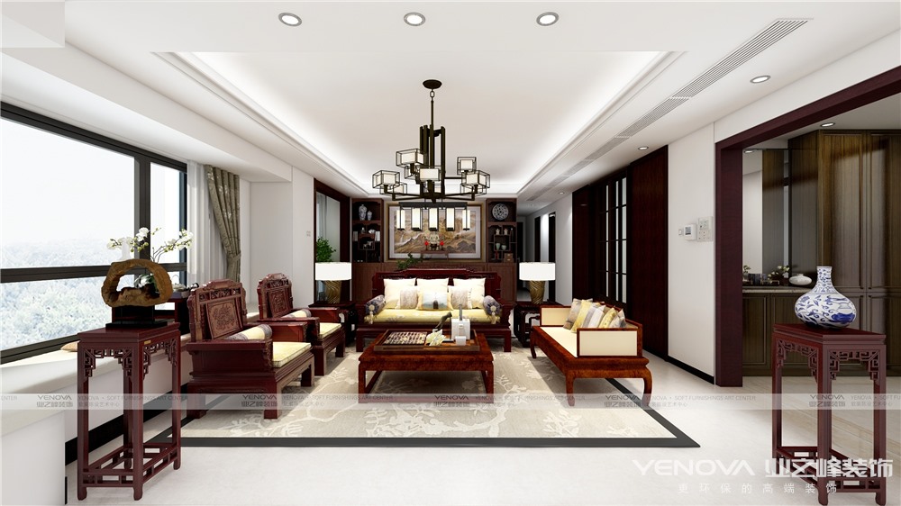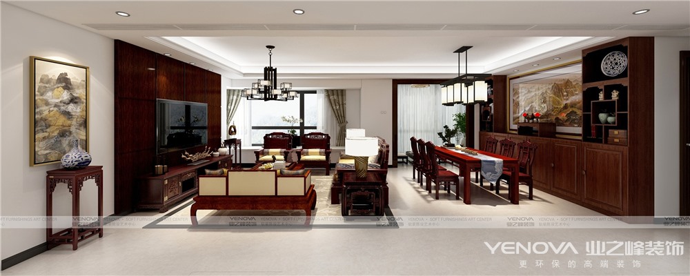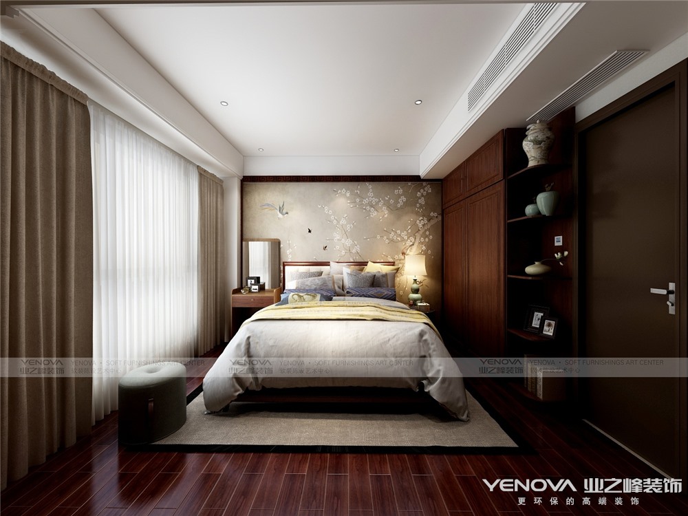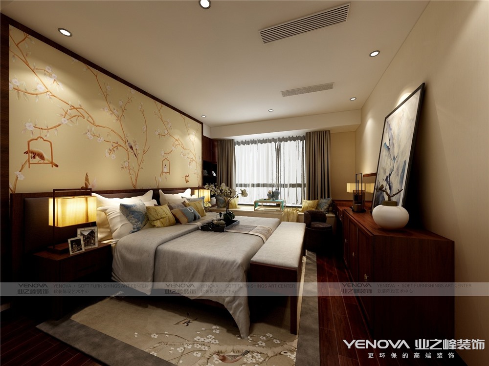 家具摆放形式,软装色调,家具尺寸,都按照风水易经讲究。客厅的大红酸枝中式家具都以实心靠背,风水意为“坐实”,坐垫布艺用帝王黄点缀,意为五行之土,餐边柜高度,佛像高度,都按照风水鲁班尺精确定位。卧室则更注重客户在该环境的心态情绪,温馨的暖黄色调,柔软的灯光透过布艺灯罩,打在墙布上形成层层光斑,棉麻锦缎,花鸟墙绘,茶灯杯盏,无不烘托东方之韵律。