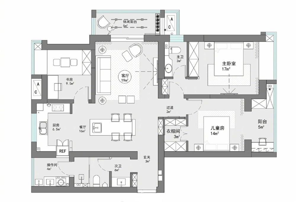 本案为一套居住的三室户型。整体简约明亮、清爽的格调。本方案尤其在空间划分及利用上独树一帜,空间上功能划分详细,衣帽间,洗漱间,空间利用上入户鞋柜,餐厅置物柜,卫生间壁龛等。