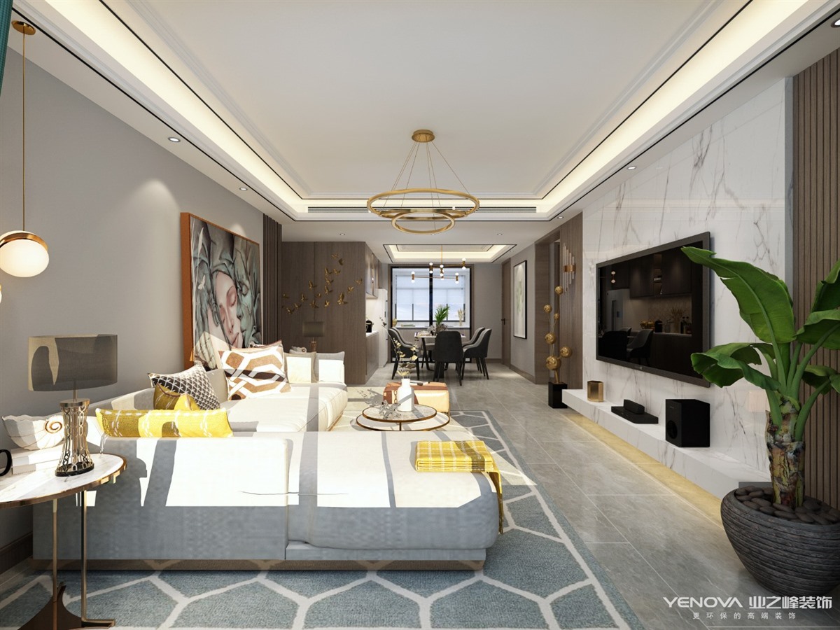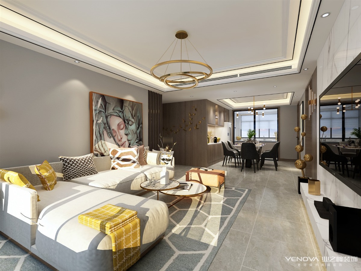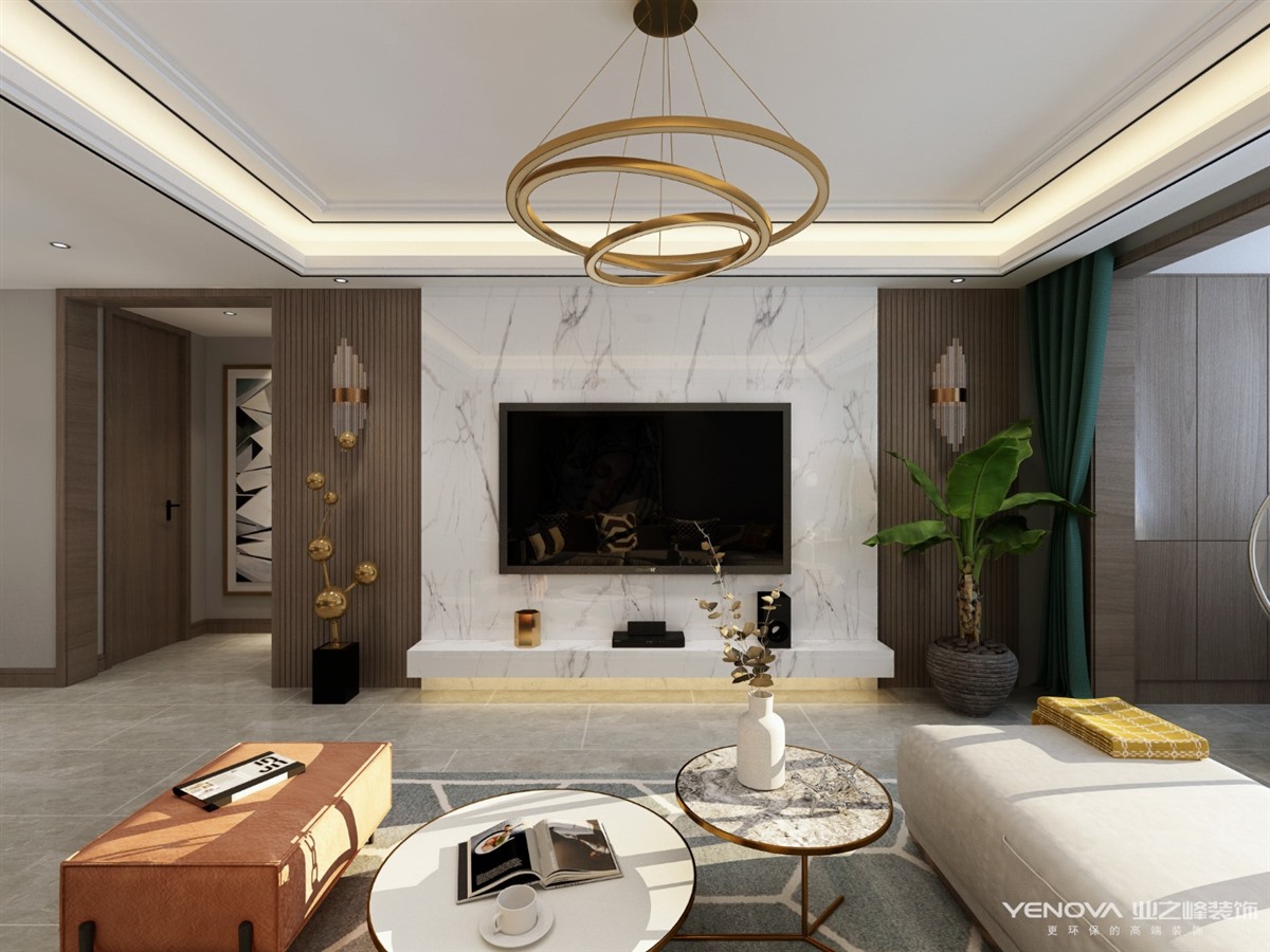 整体配色以经整体配色以经典灰白为主,配以咖金,简洁耐看。客厅以灰白大理石纹主墙色做背景,搭配古铜色做矩形镶边点缀。