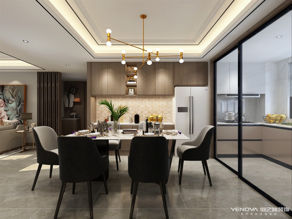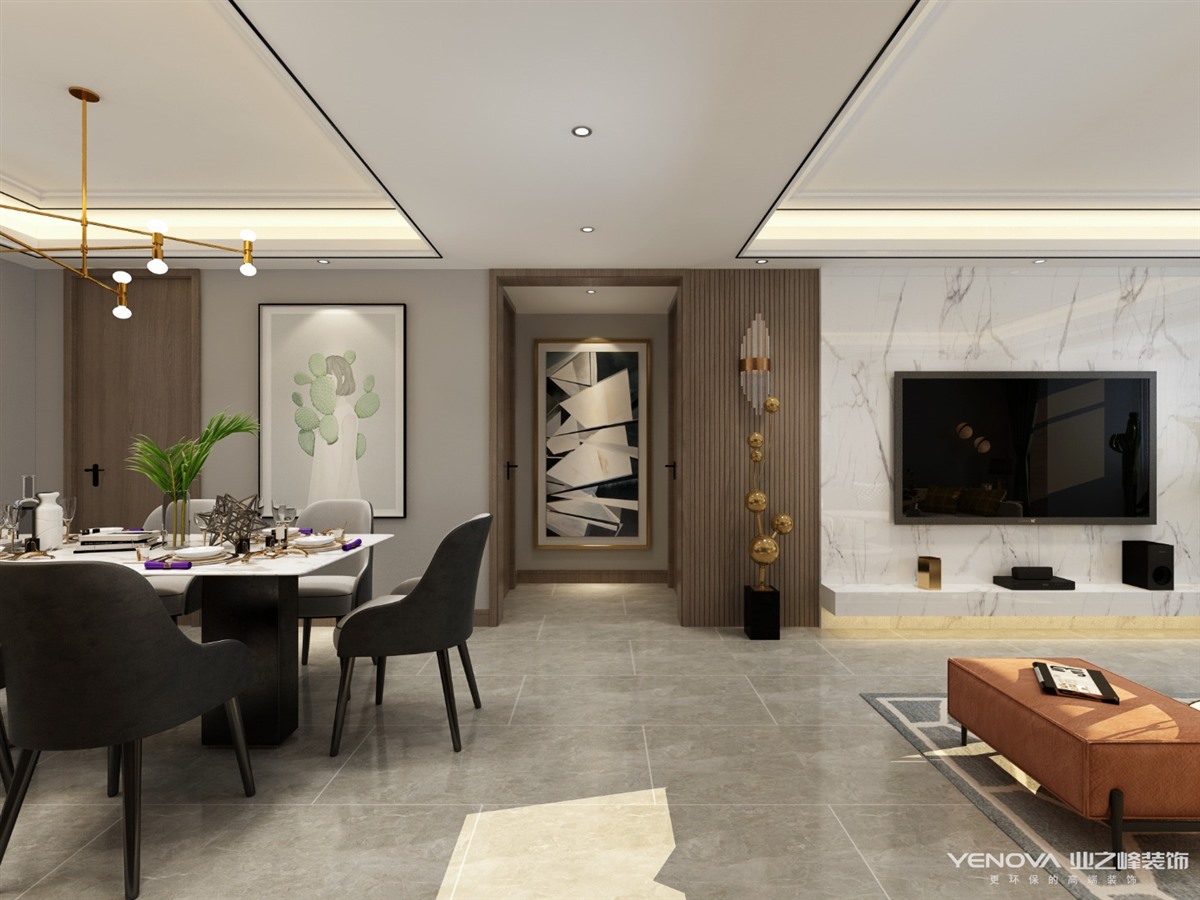 典灰白为主,配以咖金,简洁耐看。客厅以灰白大理石纹主墙色做背景,搭配古铜色做矩形镶边点缀。