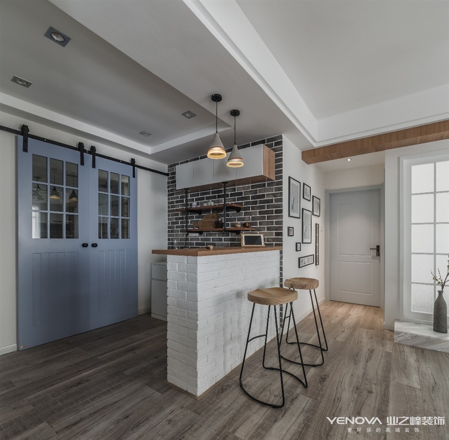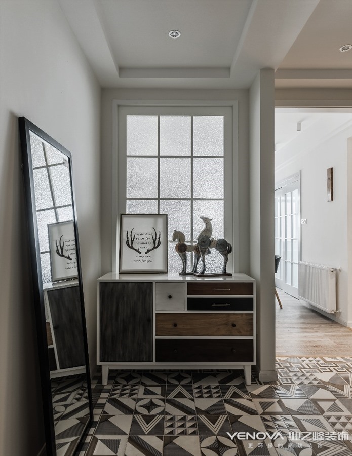 设计师用浅蓝色打底,几种不同的色彩点缀,看似简单的几笔,却把玄关的使命自然流露了出来,即与居者完成短暂的生活仪式感。