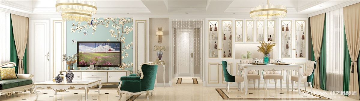 餐厅设计带有典型的欧式气质,白色的墙壁和金色线条搭配,营造一种贵族生活的气息;而顶上的精美吊灯,高贵典雅,舒展自然,让你在就餐时也能得到瞬间放松。