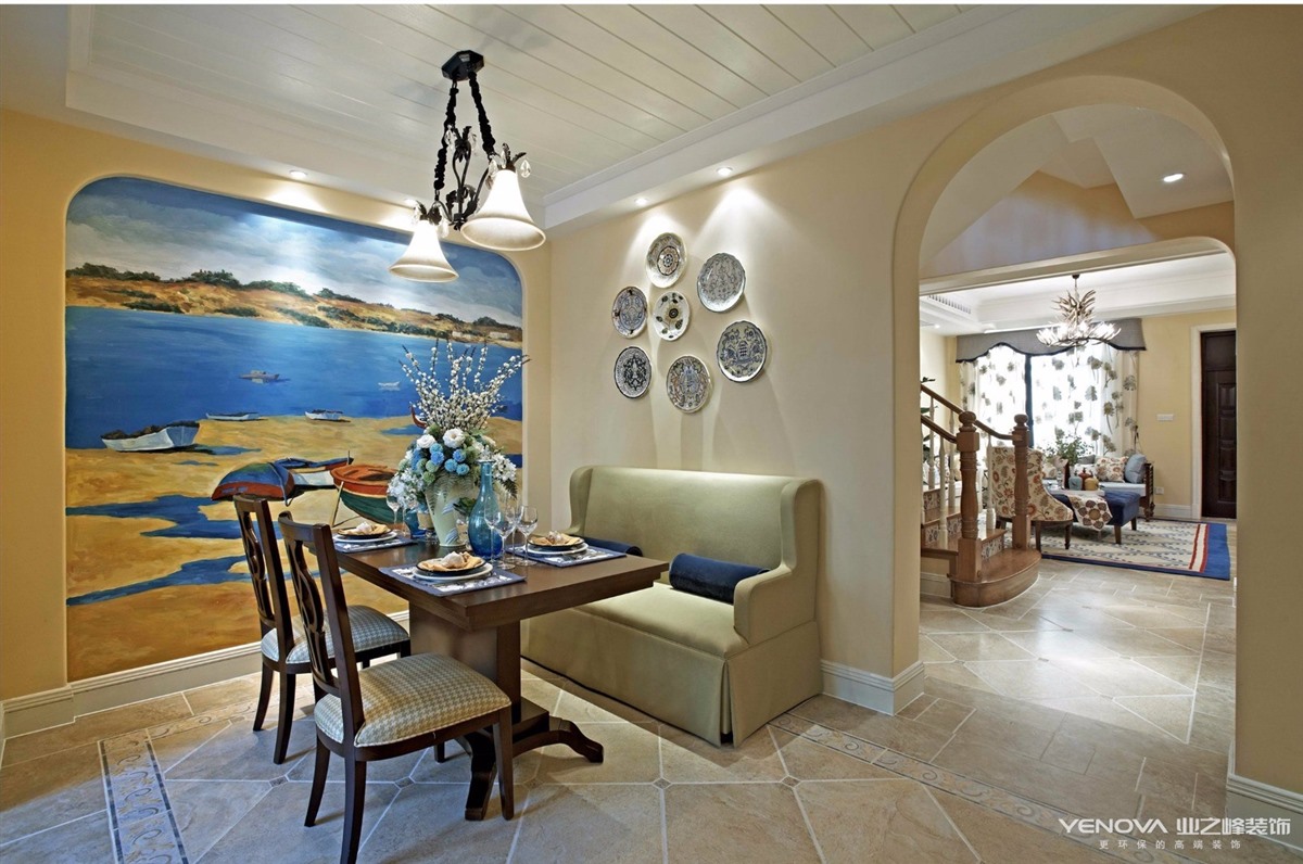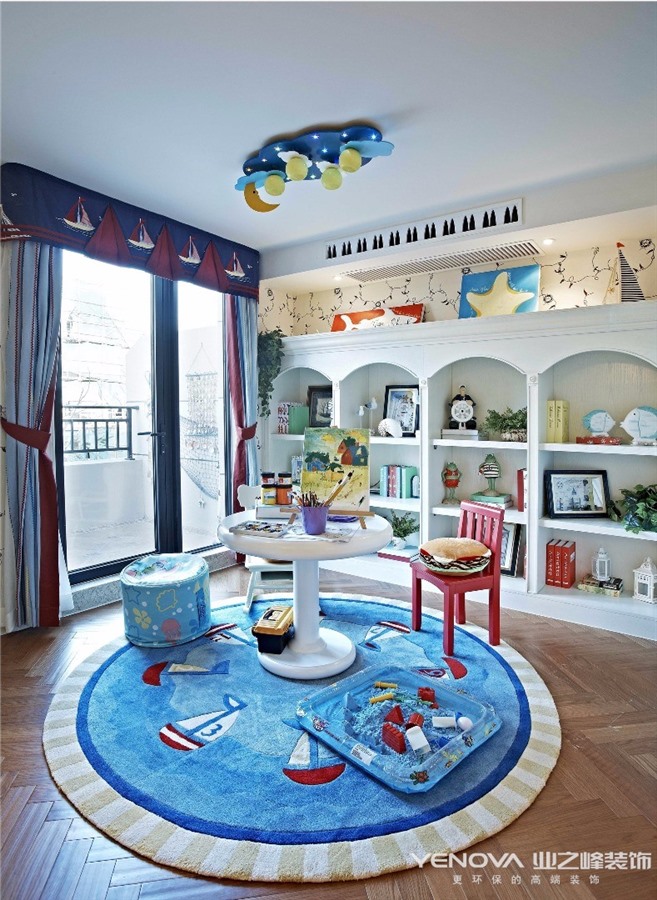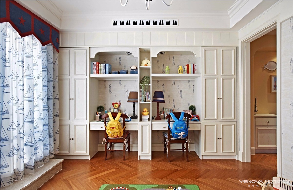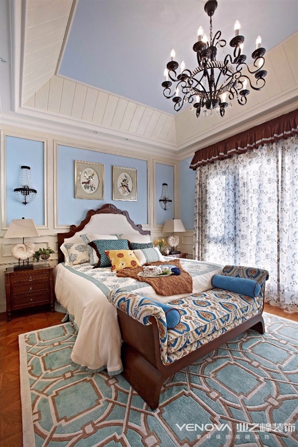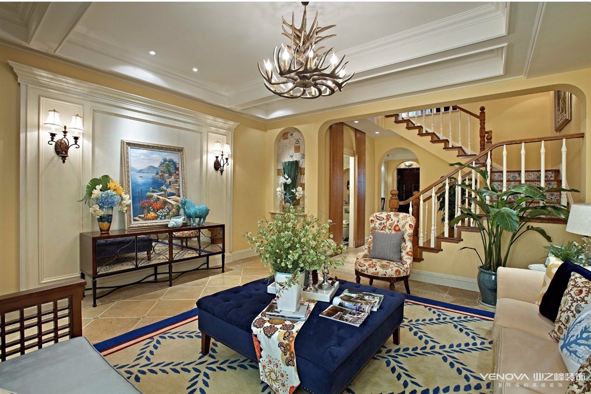 此计方案的业主,风格定位为美式风格。美式风格的设计理念主要表现为追求华丽、高雅的古典风格。居室色彩主调以白色为主,家具则为古典弯腿式,家具、门、窗也可以都漆成白色,再辅以黄色作为辅助,配上一点蓝色,将整空间的活跃气氛带动起来,同时擅用各种花饰来进行点缀。丰富的木线变化、富丽的窗帘帷幄是西式传统室内装饰的固有搭配,空间环境多表现出一种华美、富丽、浪漫的气氛。