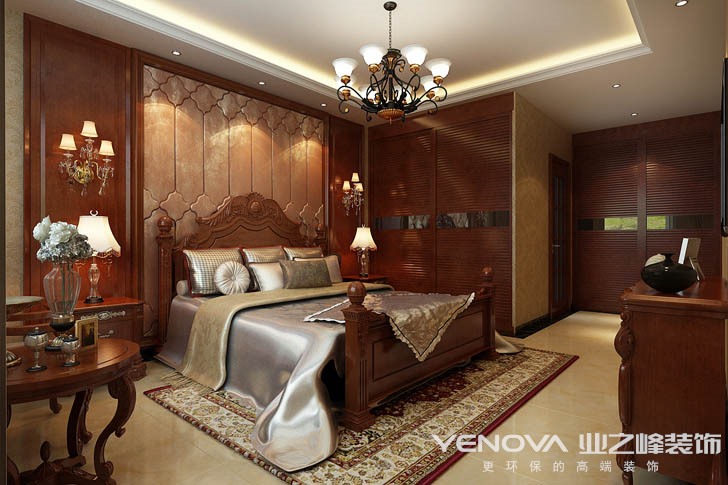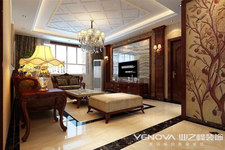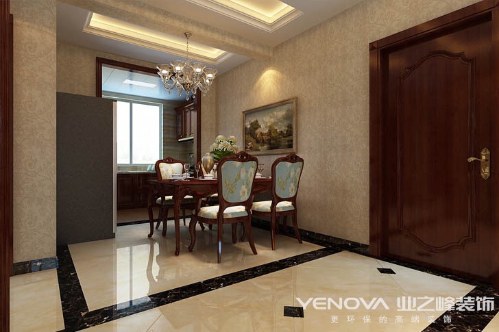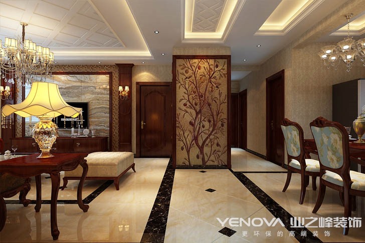 本套方案常住四口人保留了原本户型结构,选用了美式风格以舒适和多功能为主。客厅天花板采用镶嵌式石膏吊顶,搭配精致的水晶吊顶,营造出一种怀旧、浪漫的感觉。以微晶石作为地面装饰材料,光泽感极佳,在沙发区铺上拼花使空间区域划分更加清晰,复古造型的组合沙发,以及茶几都具有上乘的质感,让美式古典风格得以进一步的彰显,即:有文化感、有贵气感,还不能缺乏自在感与情调感。贵气加大气而又不失自在与随意的
