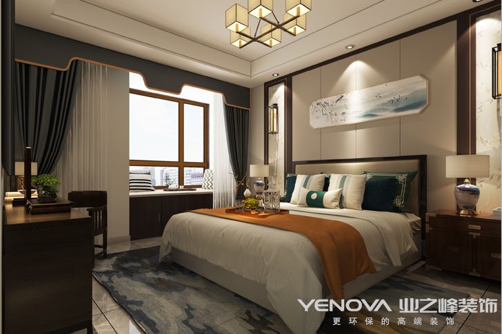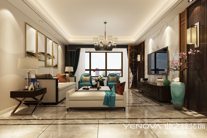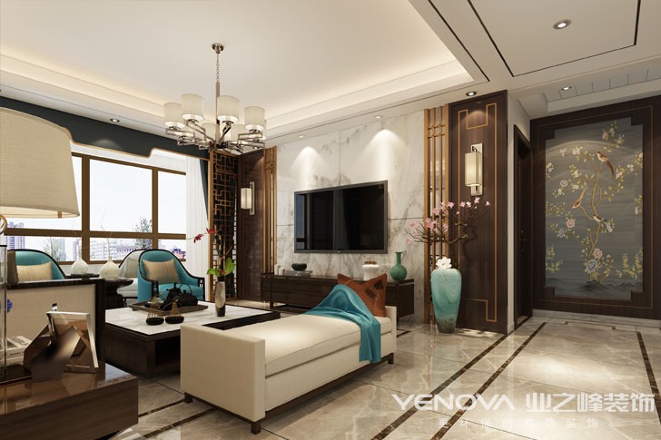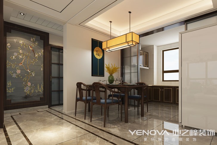 空间装饰多采用简洁硬朗的直线条。直线装饰在空间中的使用,再加上对比明显的不锈钢条,不仅反映出现代人追求简单生活的居住要求,更迎合了中式家具追求内敛、质朴的设计风格,使“新中式”更加实用、更富现代感