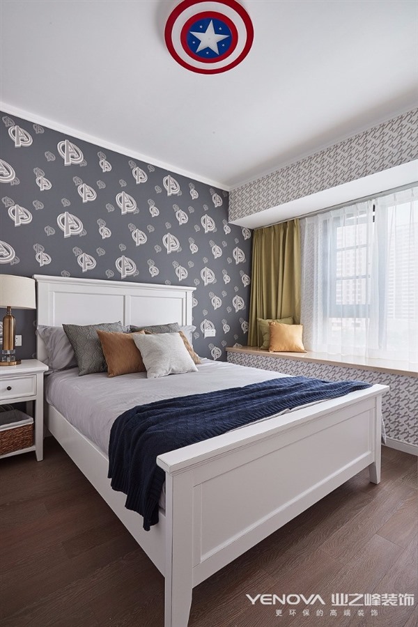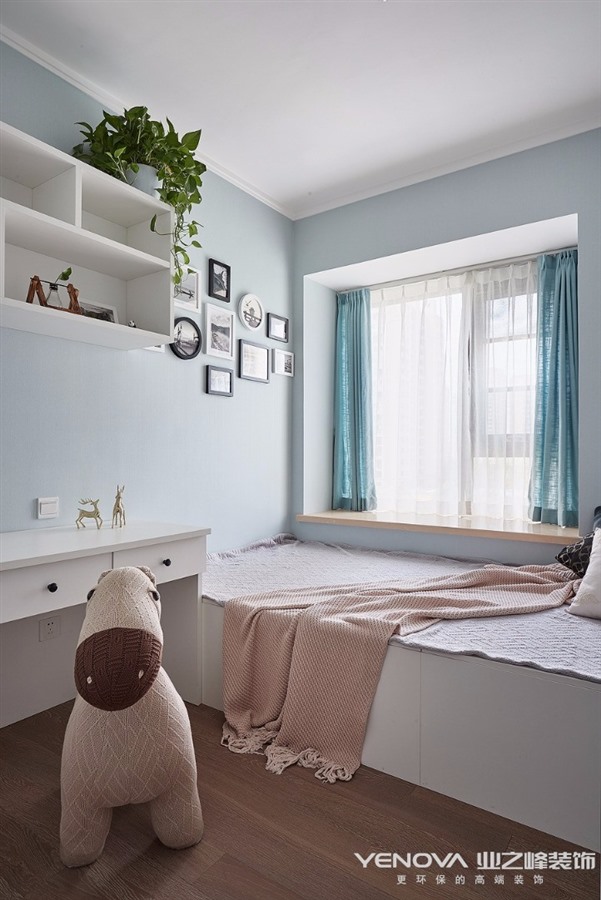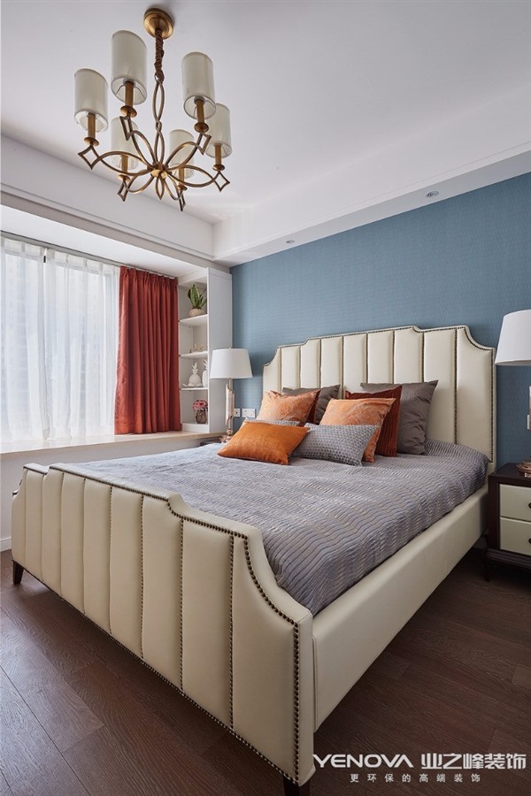 阳光透过主卧的大面窗户,让明亮自然挥洒,素色墙纸嵌入各类壁画,木色家居,润物细无声般带来内心意蕴上的迎合,令居室幽然唯美。