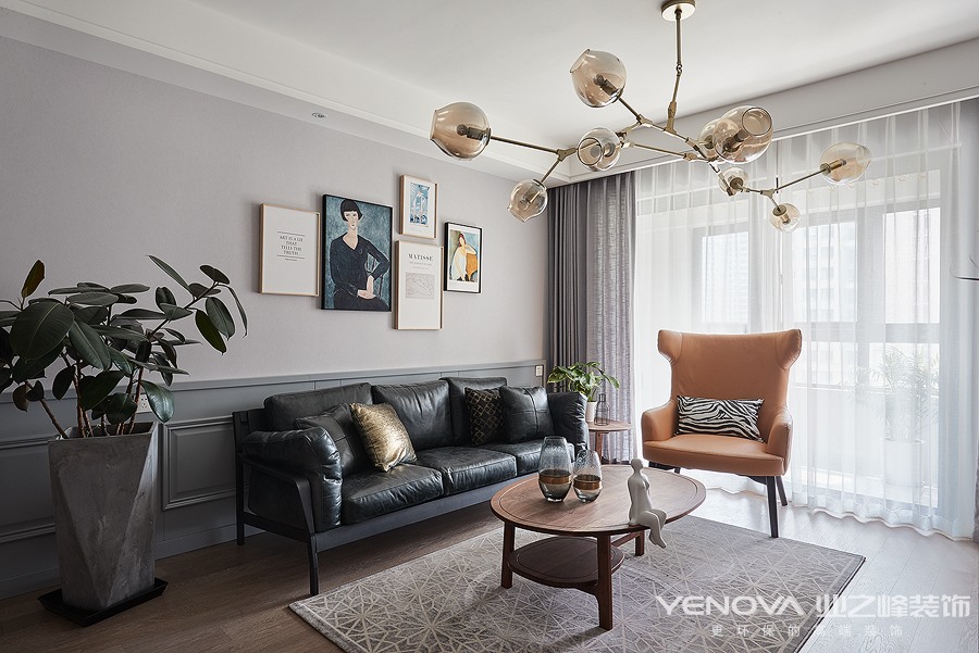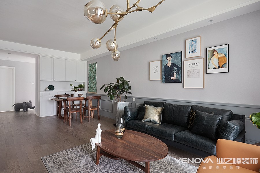 客餐厅呈纵向分布,从阳台蔓延进的光线使之保持一种通透性美感,客厅与餐厅以过道为界限,分区独立,又在形散神聚中协调出统一性。