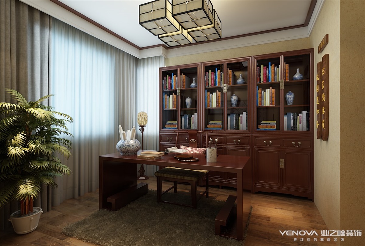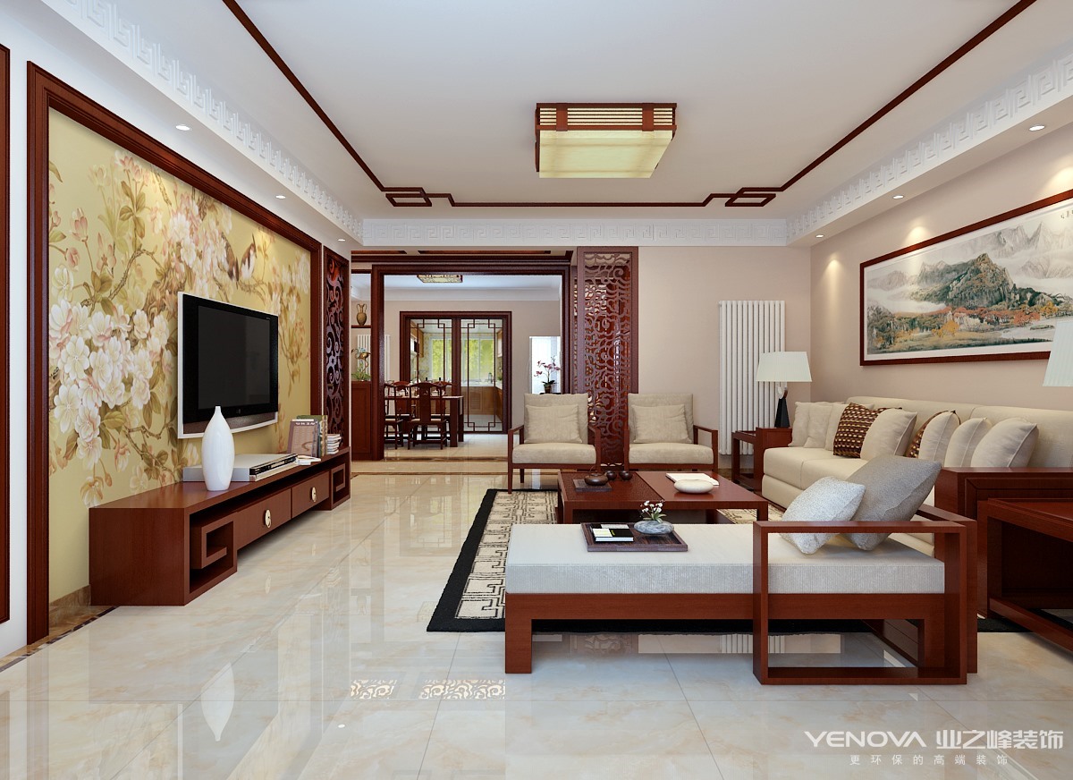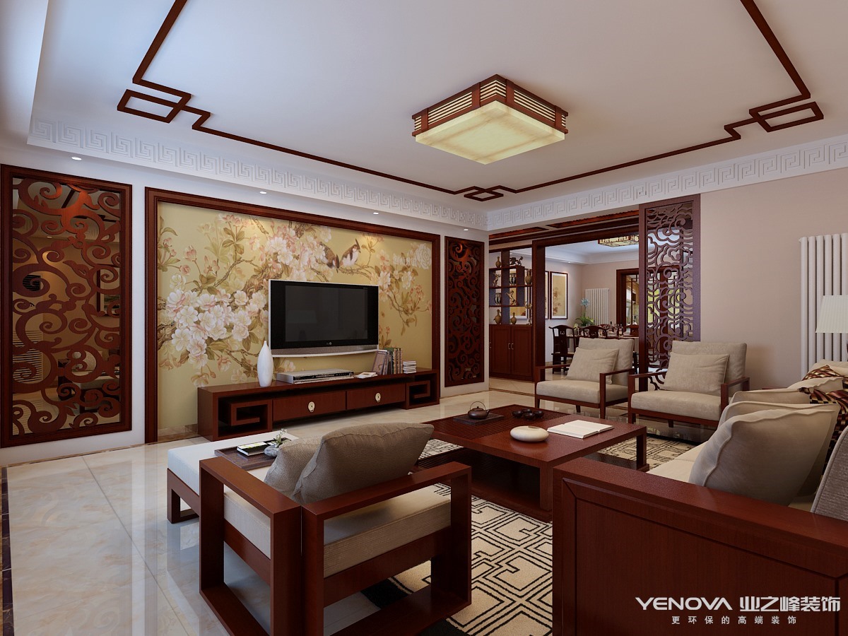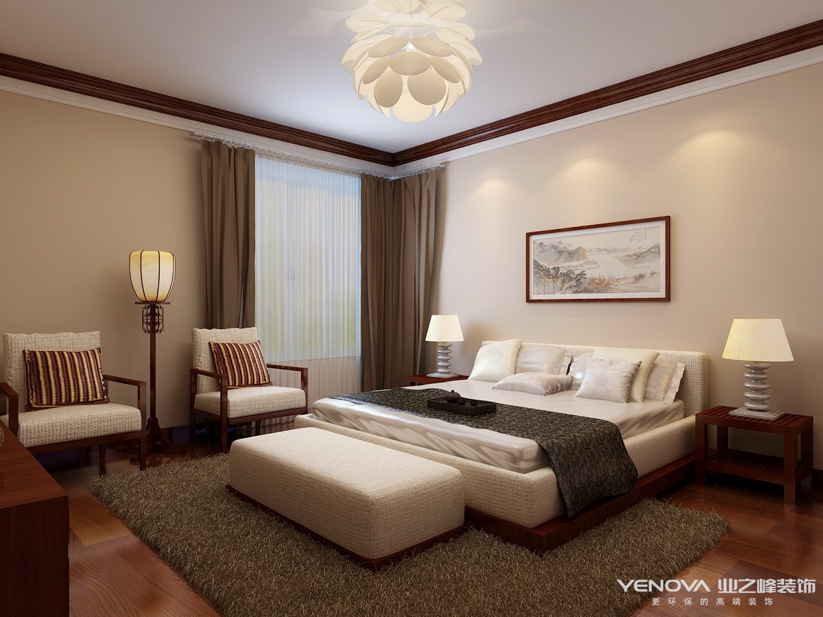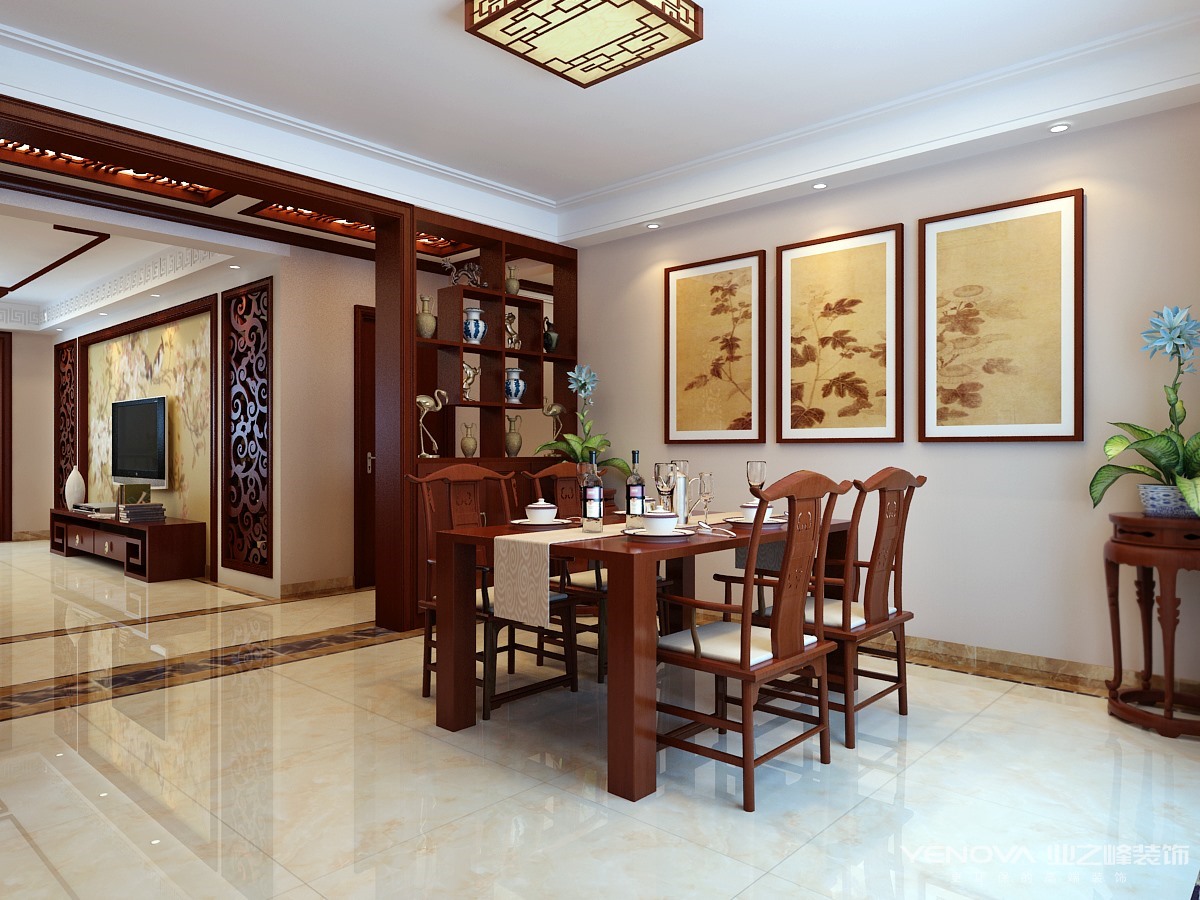 本案例采取简约新中式风格。简约是细节上精致卓越的追求,是舒适愉悦的氛围,从简洁中突出家的和谐。客厅以暖色为主调,浅色沙发布艺配以深色木纹,创造出一种古朴感,躺在这舒服的沙发上,任千年的故事顺指间流淌。餐厅顶部运用质感木梁,中式回文的悬挑台板,使餐厅与客厅和谐统一。雅致的浅褐色壁纸勾勒出整个空间的庄重。顶部的设计突出了空间的功能性,墙面线条的流畅演绎出一股汹涌的潮流,而壁画的选择却为房间的设计增加了几分优雅。中式花格、水墨韵味的墙纸、古典回字文的地毯,墙上的小装饰····所有的元素绘成了一个朴素和雅致结合的中式空间。