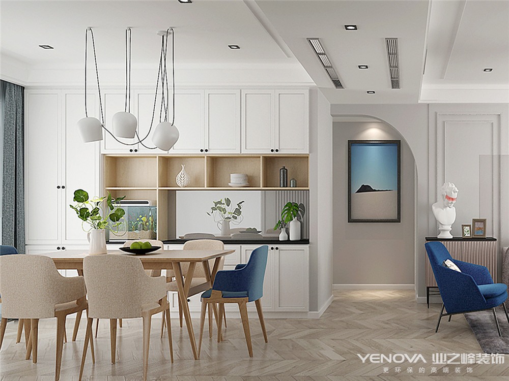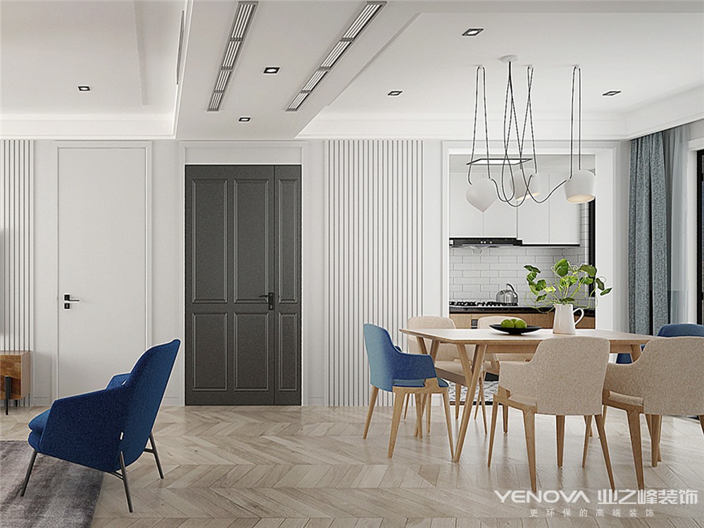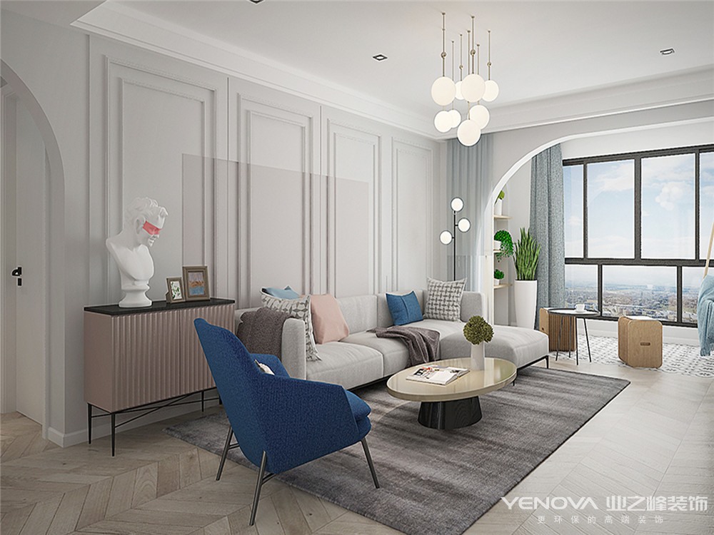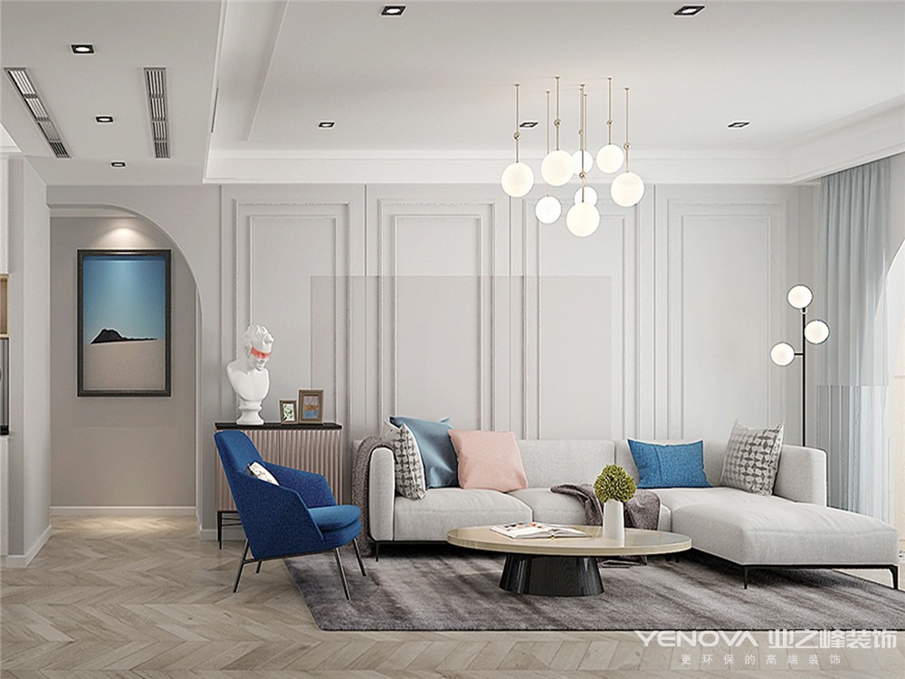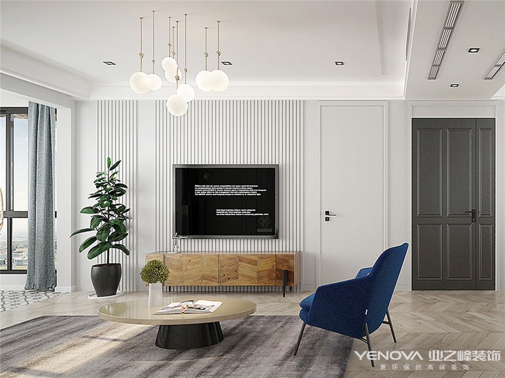本案的设计风格为北欧风格,北欧风格的居家家具,浅淡的色彩、洁净的清爽感,让居家空间得以彻底降温。客厅空间的布置重点在于家具的选购与色彩以及布品的搭配,协调、对称的技巧,让每一个细节的铺排,都呈现出令人感觉舒适的气氛。