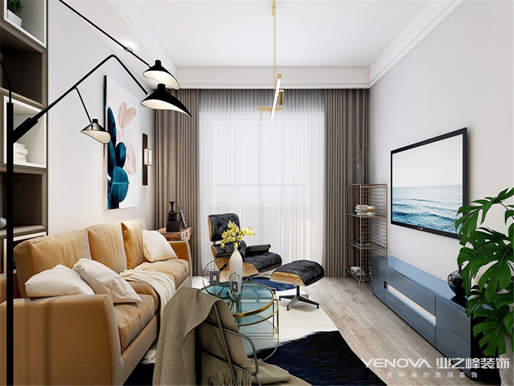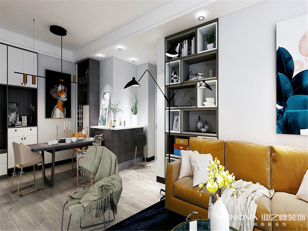 1:整体色调为灰白色,沙发大胆的使用明亮系的黄色作为整个空间的跳色,抓人眼球,玻璃与金属搭配的茶几彰显个性,更加凸显现代简约风格。 2.餐厅部分单独做了吧台设计,在平时可以作为休闲一脚,既利用了空间,又大大提升了美观程度。3.吊顶部分配合主墙体结构,提高整间屋子的风格,更加精致有氛围,彰显业主品味。