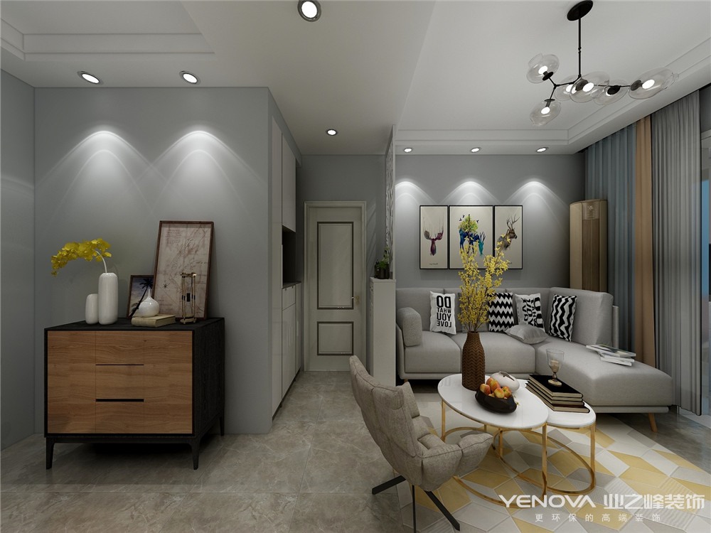 本案设计整体采用现在最为流行的北欧风格,以白色为主色调,再以温暖的原木色和明亮的黄色加以点缀,再搭配质感十足的石材、铁艺和布艺,使空间看上去更加干净温暖,清新自然