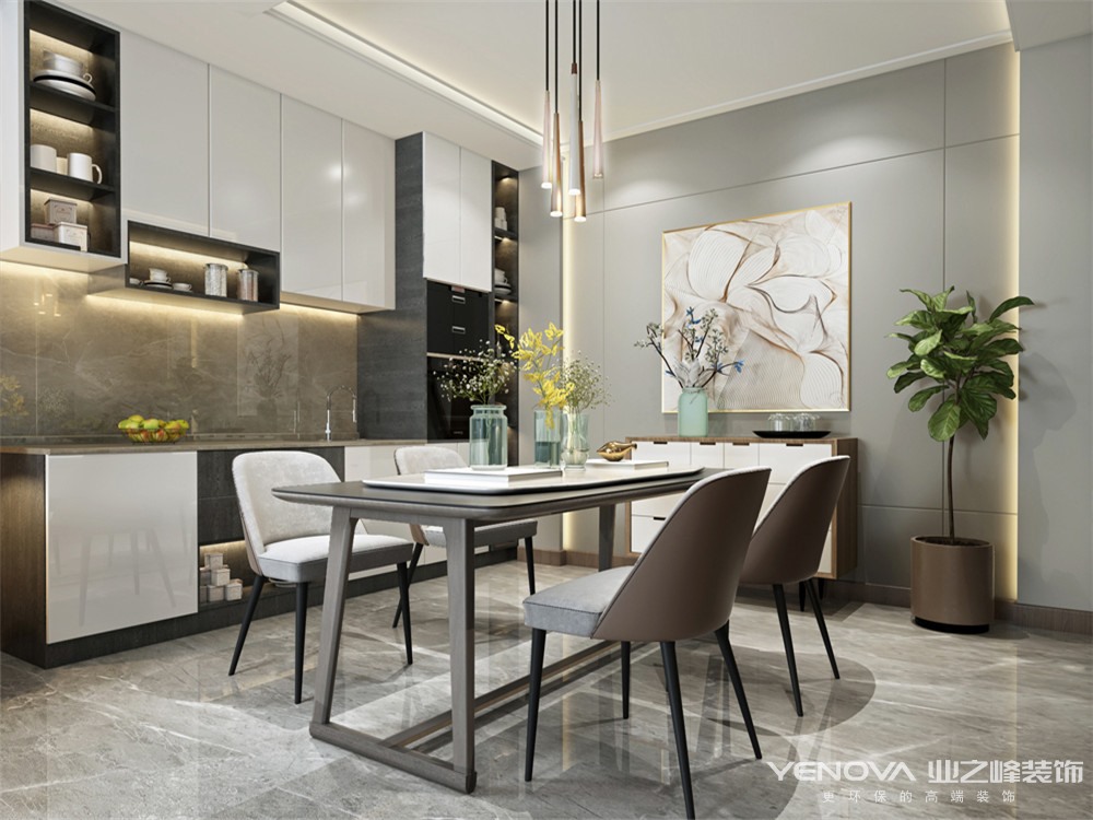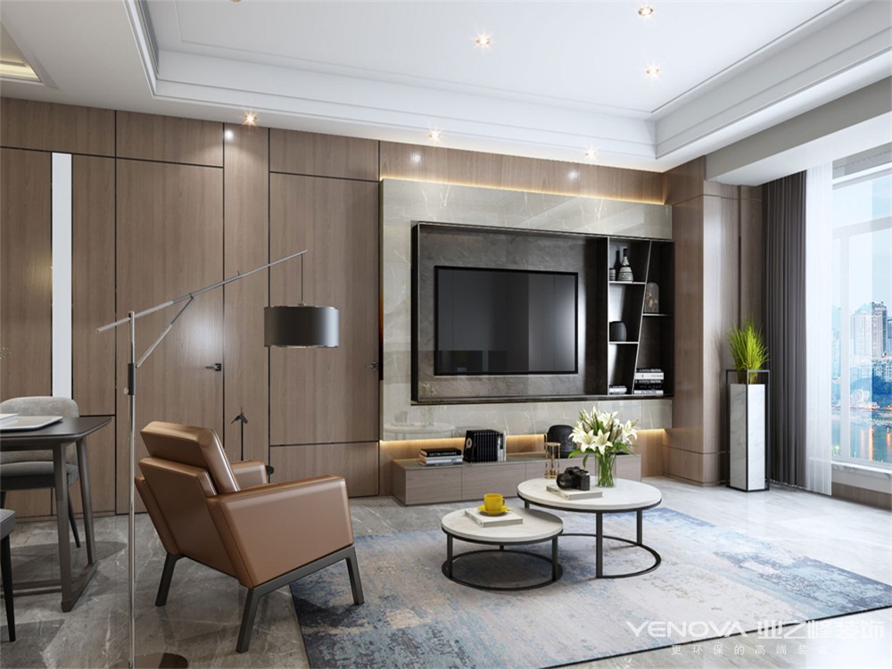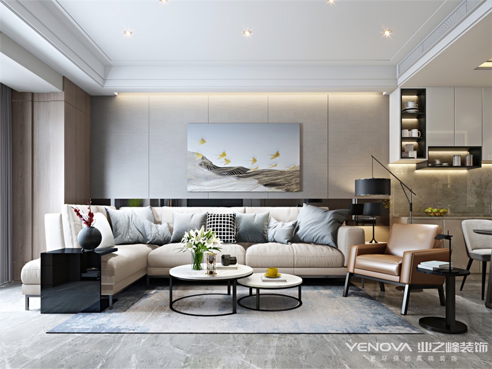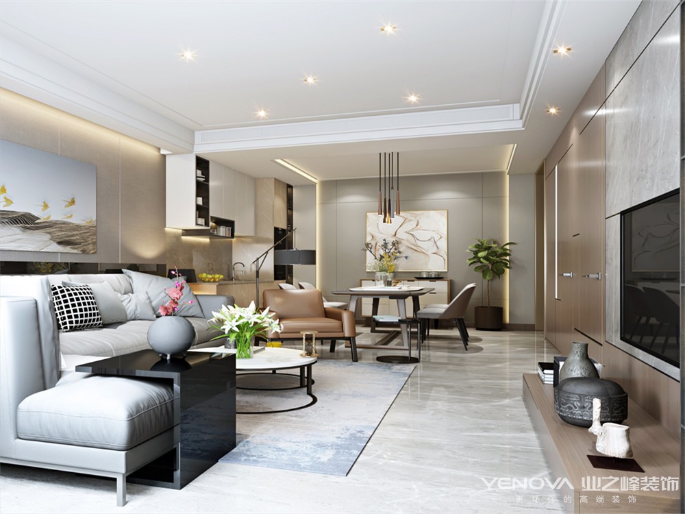 本案的设计风格为现代简约风格,回归本真的极简是一种境界,以化繁为简的智慧给生活做减法,让心灵逃离喧嚣得以安放休憩。选用木色为主色碰撞白色和蓝色,咖色皮质沙发与羊毛地毯一唱一和,工艺的精细度如同主人对生活情怀的追求,散发着品质优雅沉浸式的空间气韵。