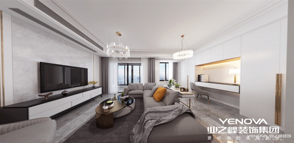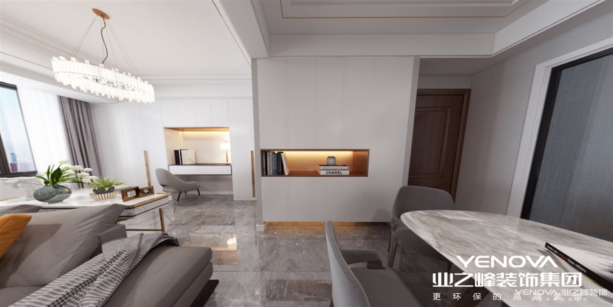 苏州业之峰装饰姑苏铭著115平现代轻奢设计图,本案以现代轻奢风格为主,在色彩选择上,轻奢风格一般会选用带有高级感的中性色,诸如驼色、象牙白、奶咖、黑色及碳灰色,来演绎一种“低调的奢华”,令空间质感更为饱满。驼色、象牙白都是倾向于高雅调性的色彩,它们简约、时髦且富有轻奢气质,运用在家居设计中,可以在呈现温馨大气的格调之余,又牵引出浓浓的时尚高雅范儿。虽然整体基调给人以简洁、淡雅的感觉,但是紫灰色和黑色的精彩运用,却可以起到画龙点睛的作用,不仅让原本单调的空间更添层次,华丽感也瞬间提升。