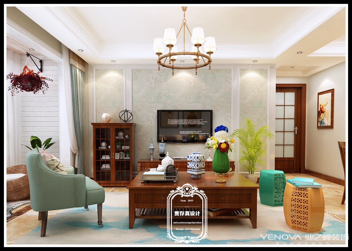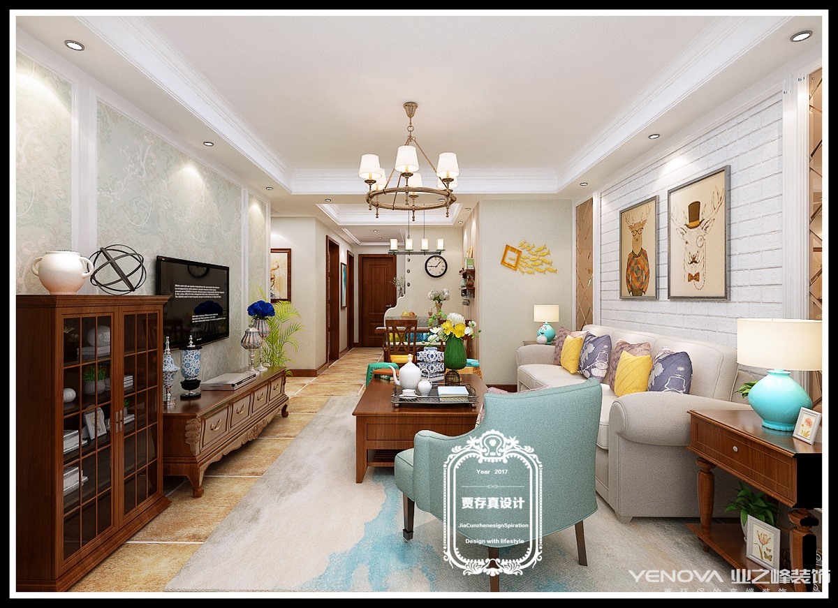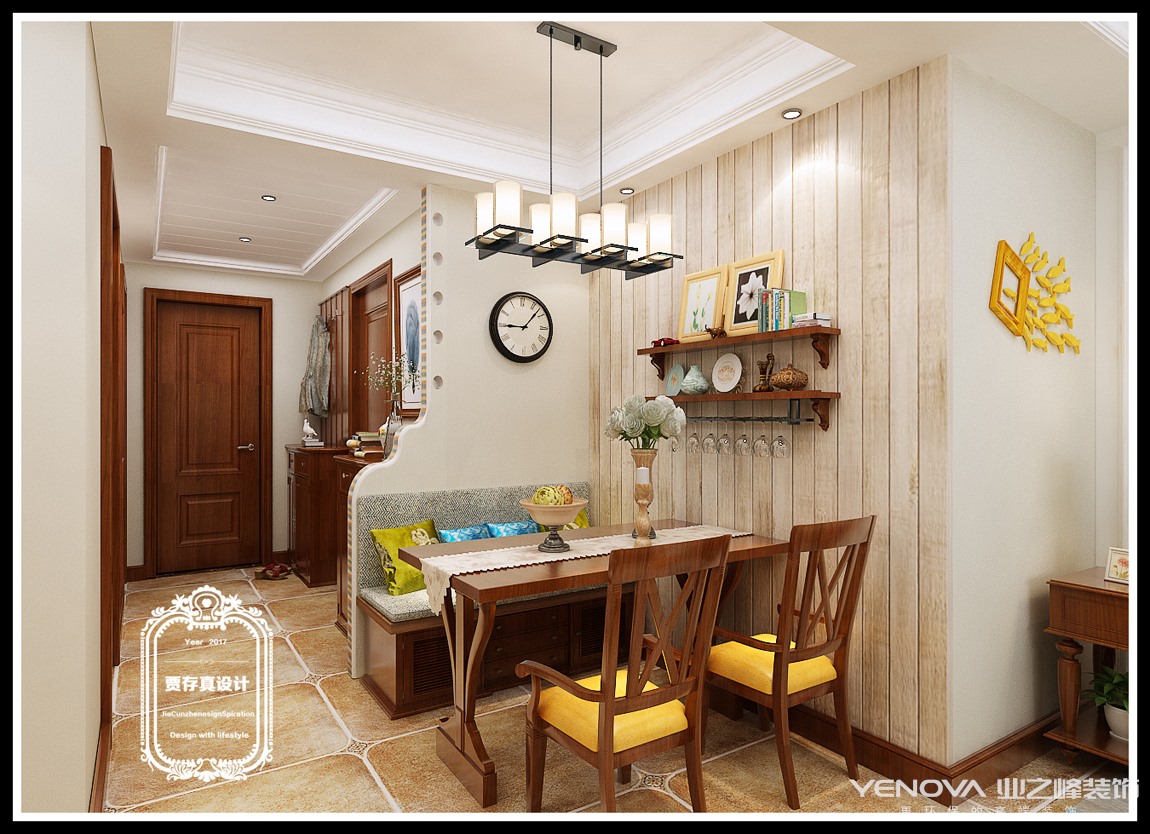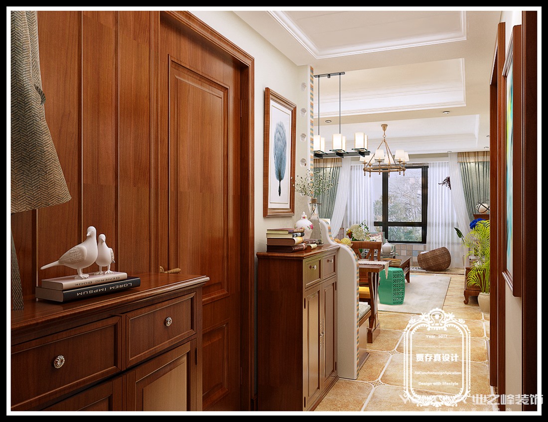 客厅作为待客区域,一般要求简洁明快,同时装修较其它空间要更明快光鲜,通常使用大量的石材和木饰面装饰;美国人喜欢有历史感的东西,这不仅反映在软装摆件上对仿古艺术品的喜爱,同时也反映在装修上对各种仿古墙地砖、石材的偏爱和对各种仿旧工艺的追求上。总体而言,美式田园风格的客厅是宽敞而富有历史气息的。