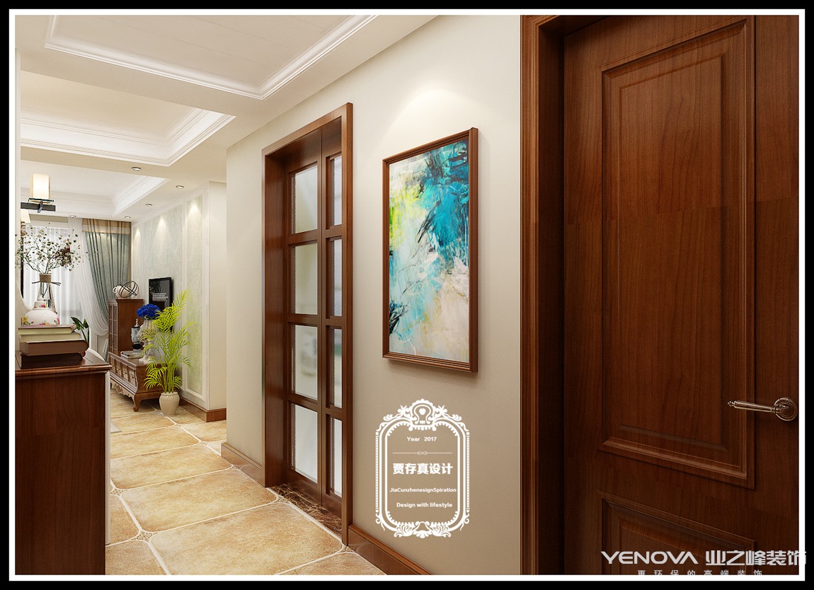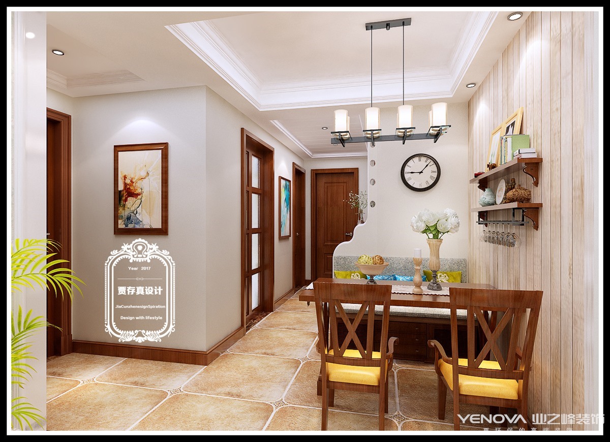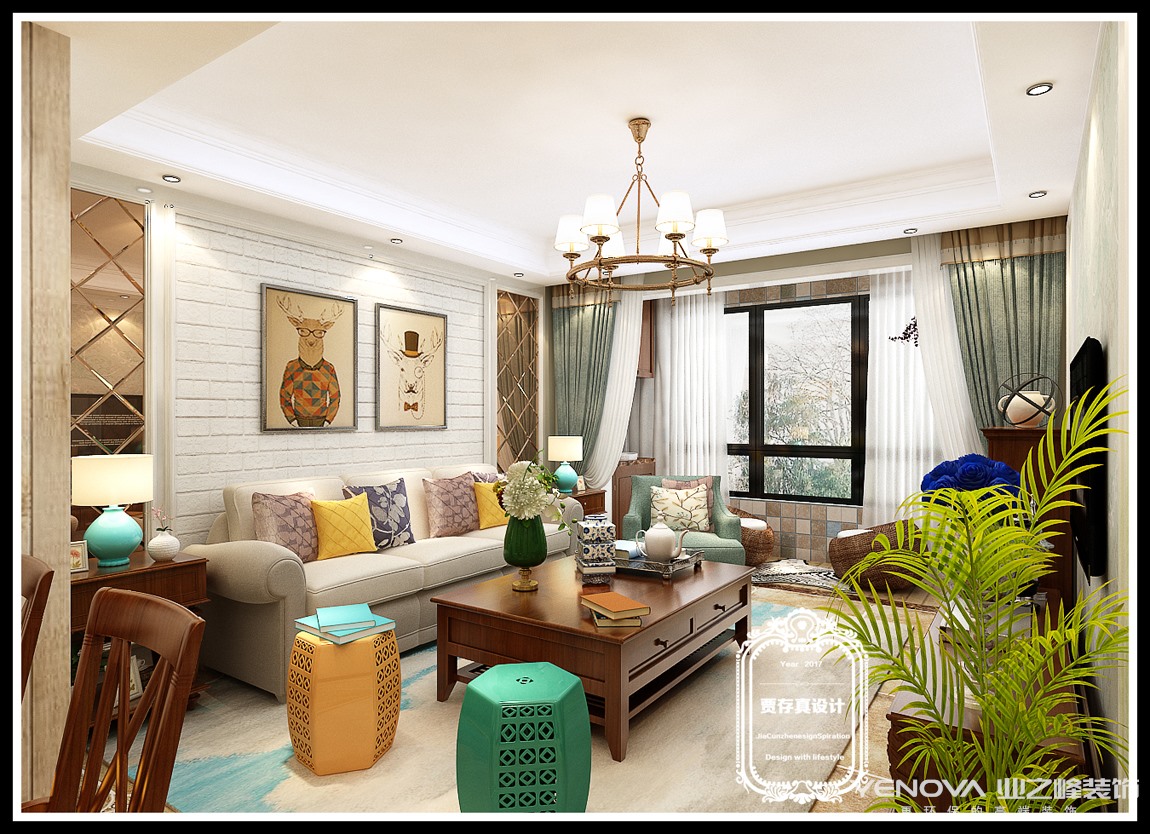 客厅作为待客区域,一般要求简洁明快,同时装修较其它空间要更明快光鲜,通常使用大量的石材和木饰面装饰;美国人喜欢有历史感的东西,这不仅反映在软装摆件上对仿古艺术品的喜爱,同时也反映在装修上对各种仿古墙地砖、石材的偏爱和对各种仿旧工艺的追求上。总体而言,美式田园风格的客厅是宽敞而富有历史气息的。