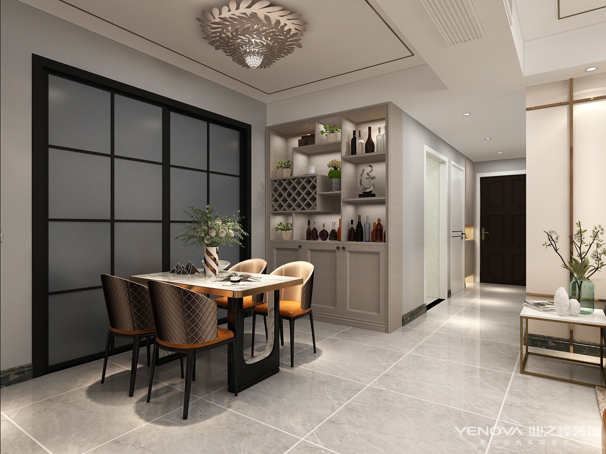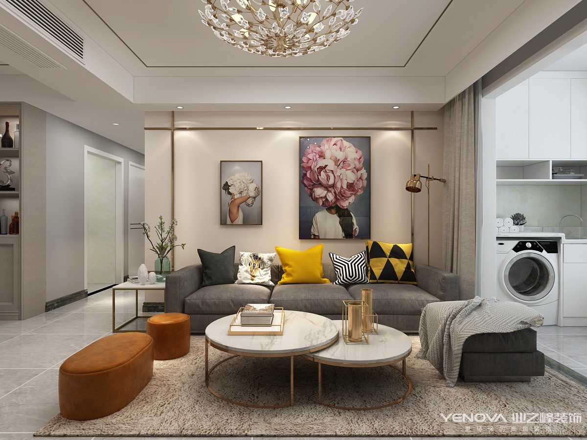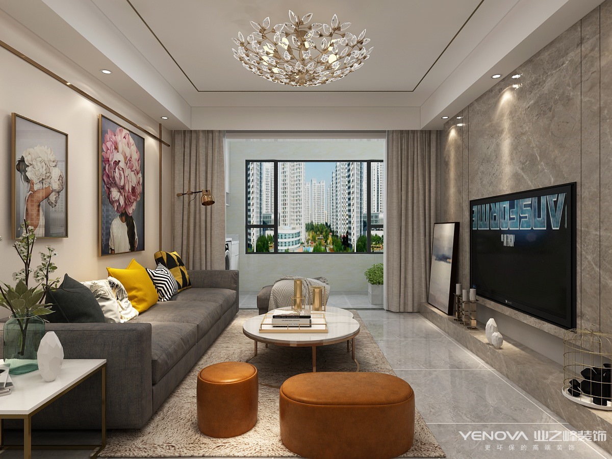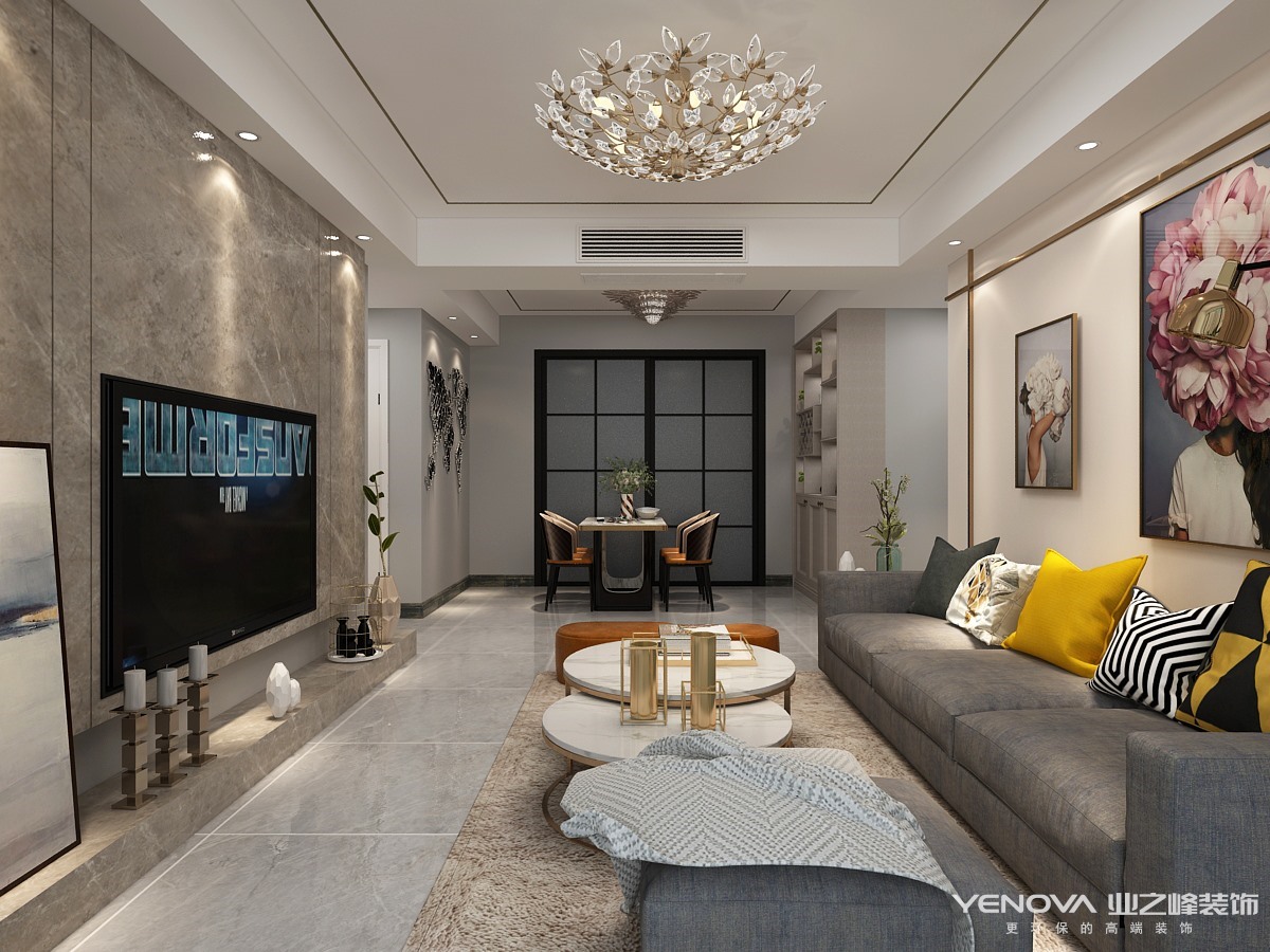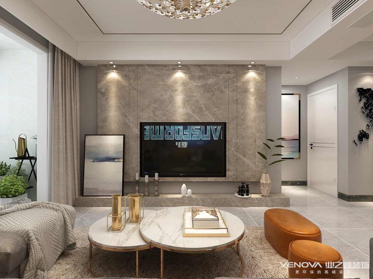 以纯度偏低的暖色色作为大面积白的辅助色,融入优雅皓白,低调奢华的金属色调。在功能方面,客厅是主人品味的象征,体现了主人品格,地位,也是交友娱乐的场合,电视背景墙采用石材、护墙板做了简单的造型处理,既简单又大方,又不失去奢华,沙发背景墙做了硬包,地砖采用灰色系,配置一些装饰品非常的简洁奢华。