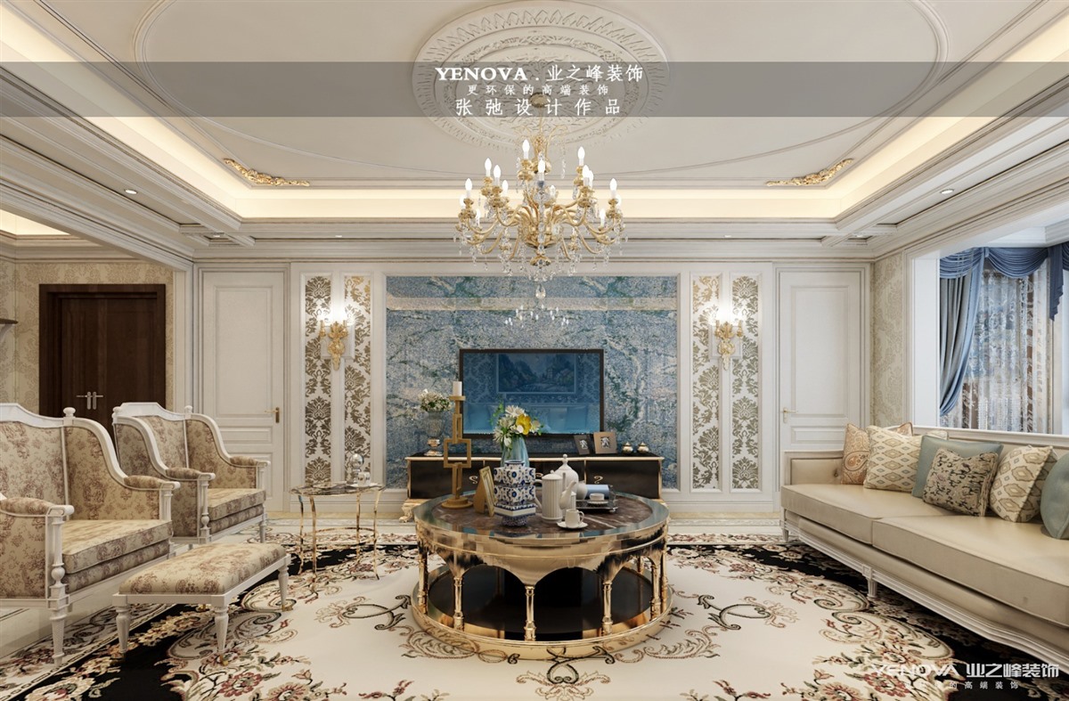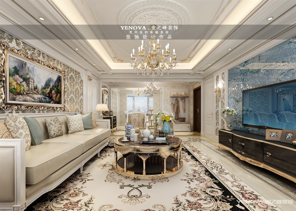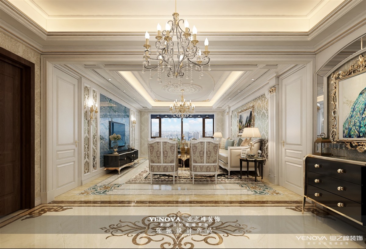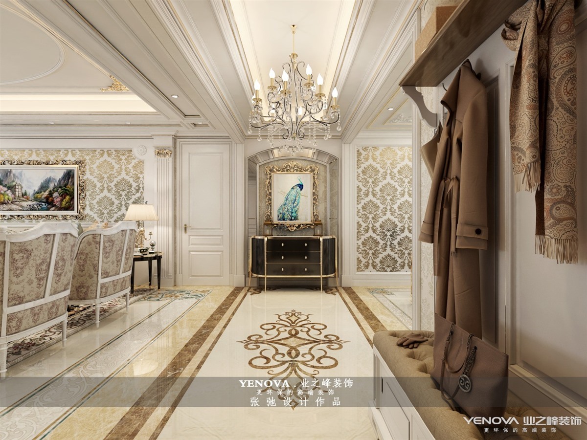 设计说明: 整个空间的布局强调轴线的对称,气势恢宏与豪华舒适相得益彰。空间呈现出高贵典雅的居家氛围。细节处理上采用雕花﹑线条﹑铜条以及不同种颜色大理石材质的拼接,其工艺精细考究。