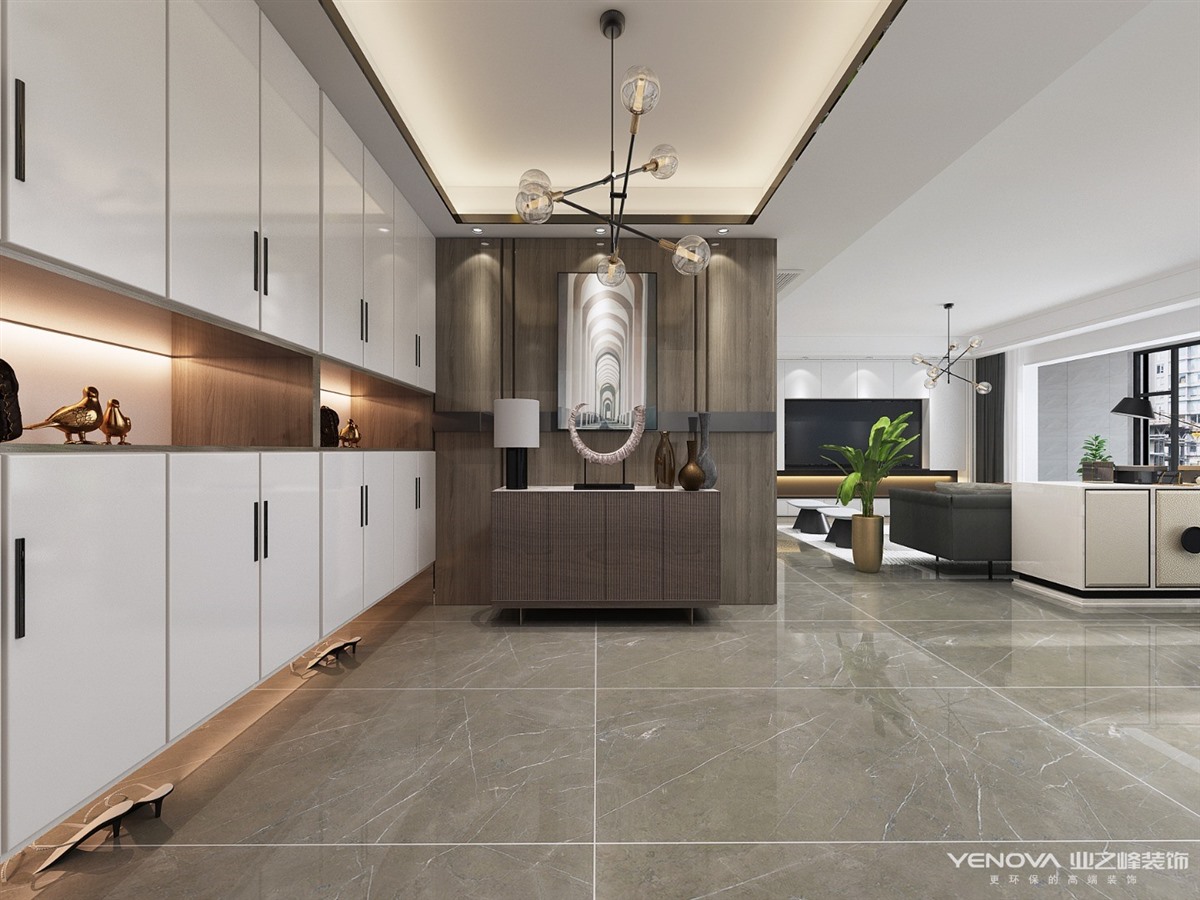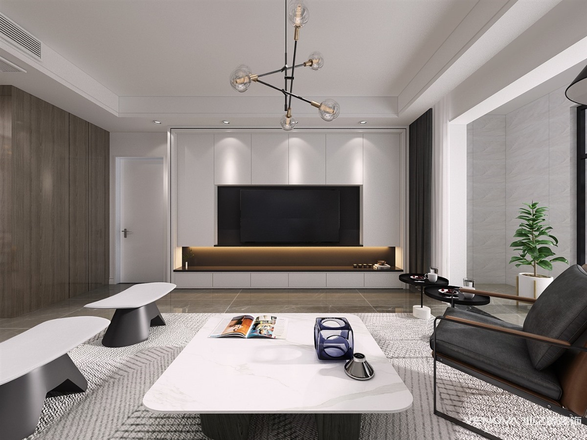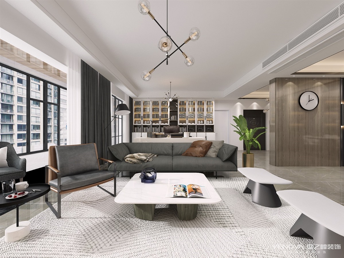 本案的主题为港式轻奢风格,简约俐落的质材铺叙与敞明大方的格局尺度,是轻奢风定调的设计居宅中,不可或缺的重要元素。在案例中,以陈设艺术品及金属线条材质来营造大气、自然、轻奢的装饰美学氛围。墙面、地面、家具陈设等均以简洁的造型、精细的工艺为其特征,强调品质感和细节处理。在色彩搭配方面以暖色为主,棉麻的搭毯、直观大气的金属材质,带着淡淡的随意,随着轻轻的希冀让人感受到的是空间弥漫的温馨与舒畅。