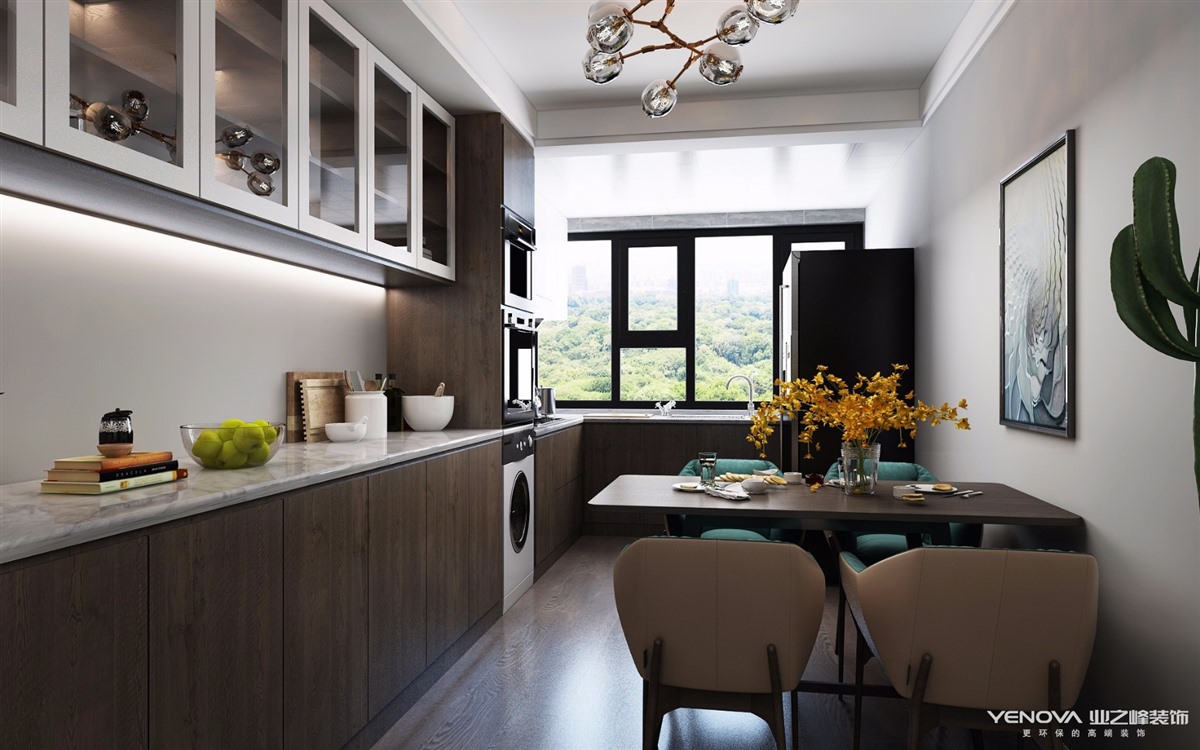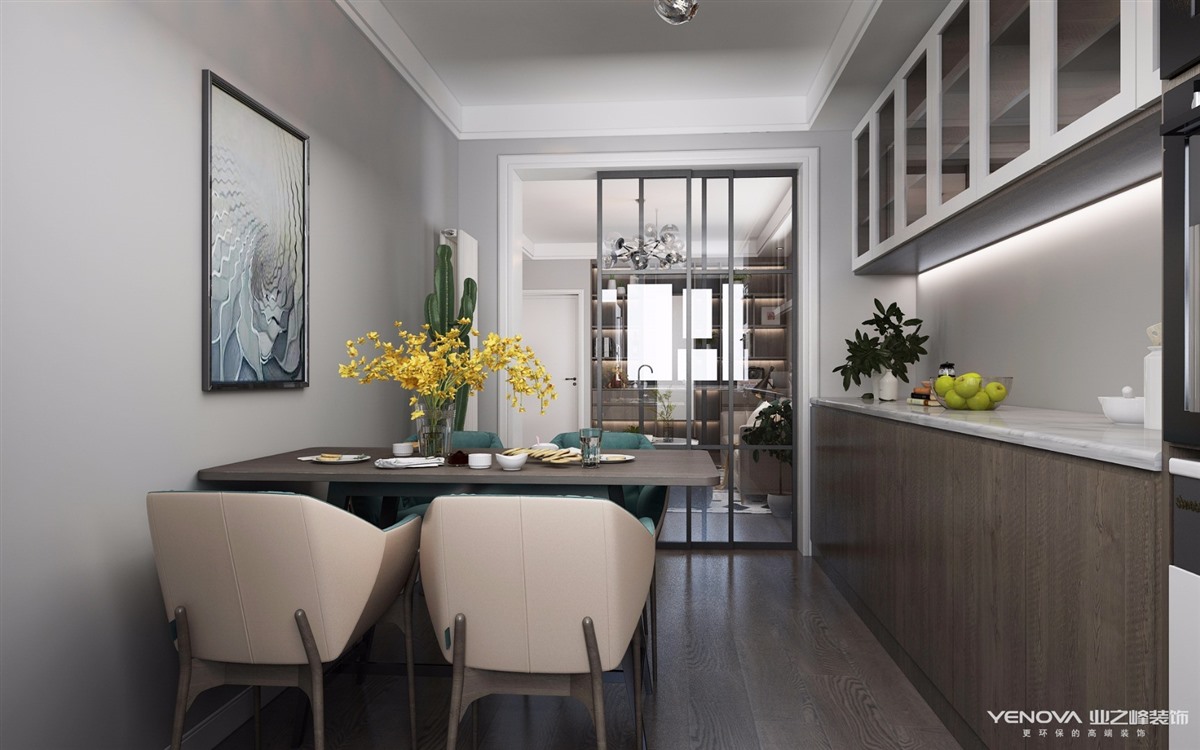 现代简约风的餐边柜,敞开式层板,摆放着精致的小餐具,在柜体的中间部分加装推拉式柜门,里面存放餐巾布、食物等比较琐碎的小物品,兼容内嵌式烤箱,整个连成一体,和谐美观。