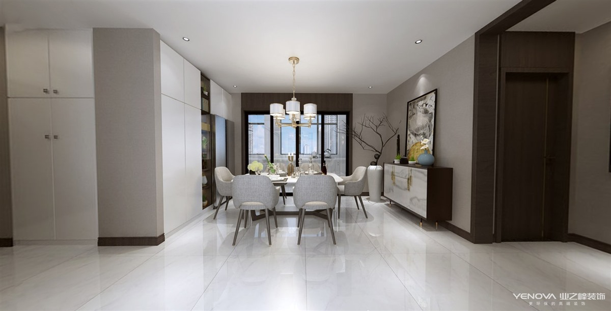 客厅以暖色调为主色调,以浅色系作为基础色,生灰的纹理地砖体现出高品质的生活,素雅的布艺沙发与茶几形成一体。餐厅则以月白色为背景墙加上米黄色的家具使整个空间优雅,大方。两个空间的颜色搭配,使空间层次更为分明。
