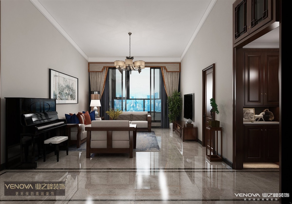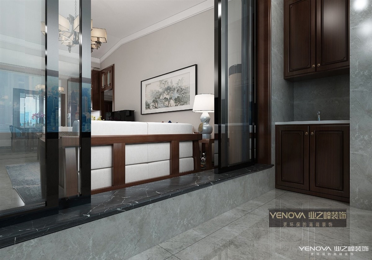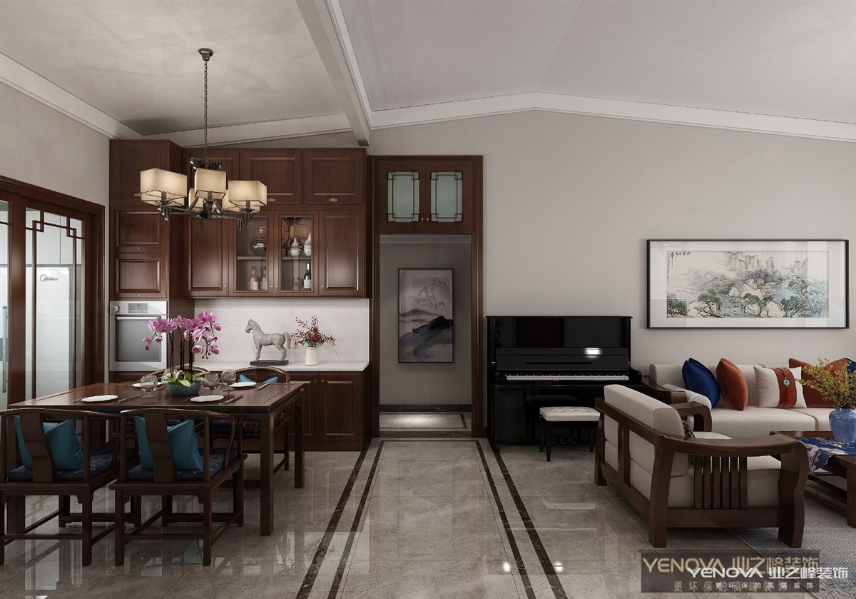 此设计方案风格倾向定位为现代中式风格。本案的设计重点是会客空间与门厅、餐厅以及过道空间互通与交流,从设计手法上采用了从墙面上的线与面的衔接呼应,以及顶面的空间的虚拟划分,达到各功能空间融会贯通的目的。