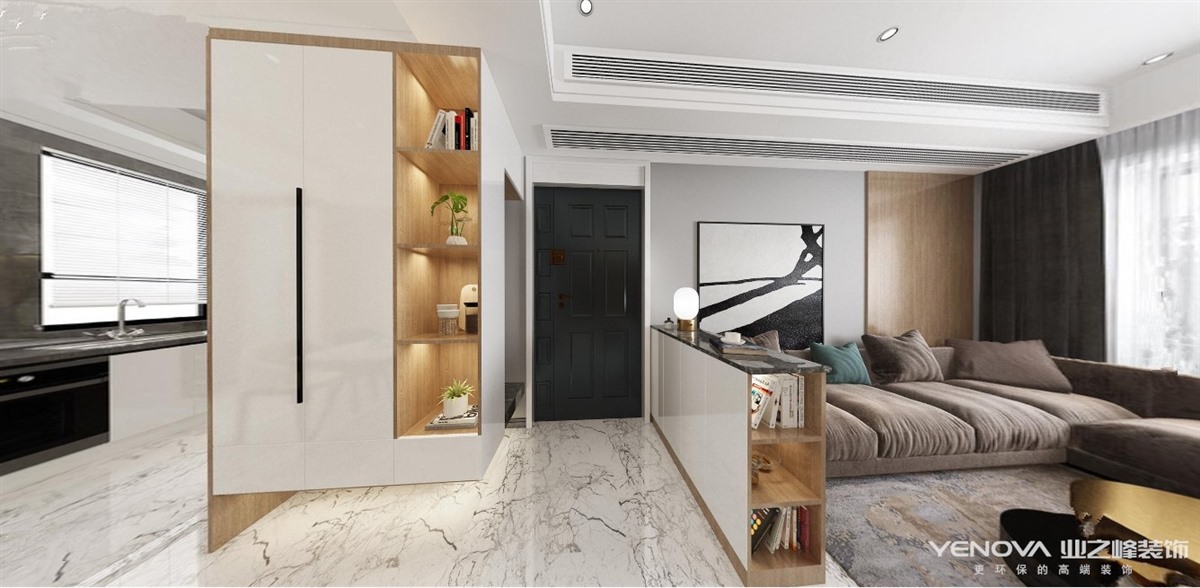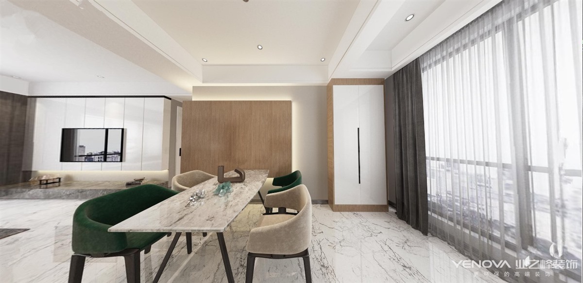 在整体的设计中,设计师采用了极简的轻奢风格,设计师放弃了主灯,全部采用叠级平顶,看起来简洁大方,电视背景采用了木饰面上墙就连收口设计师看起来也似乎被取消了,实际是被两边的新做墙体内镶了。地面选择了白色色的地砖,选用时尚极简的灰色沙发,点缀点蓝色,与灰蓝色窗帘呼应,整体看起来时尚而且简洁大方。