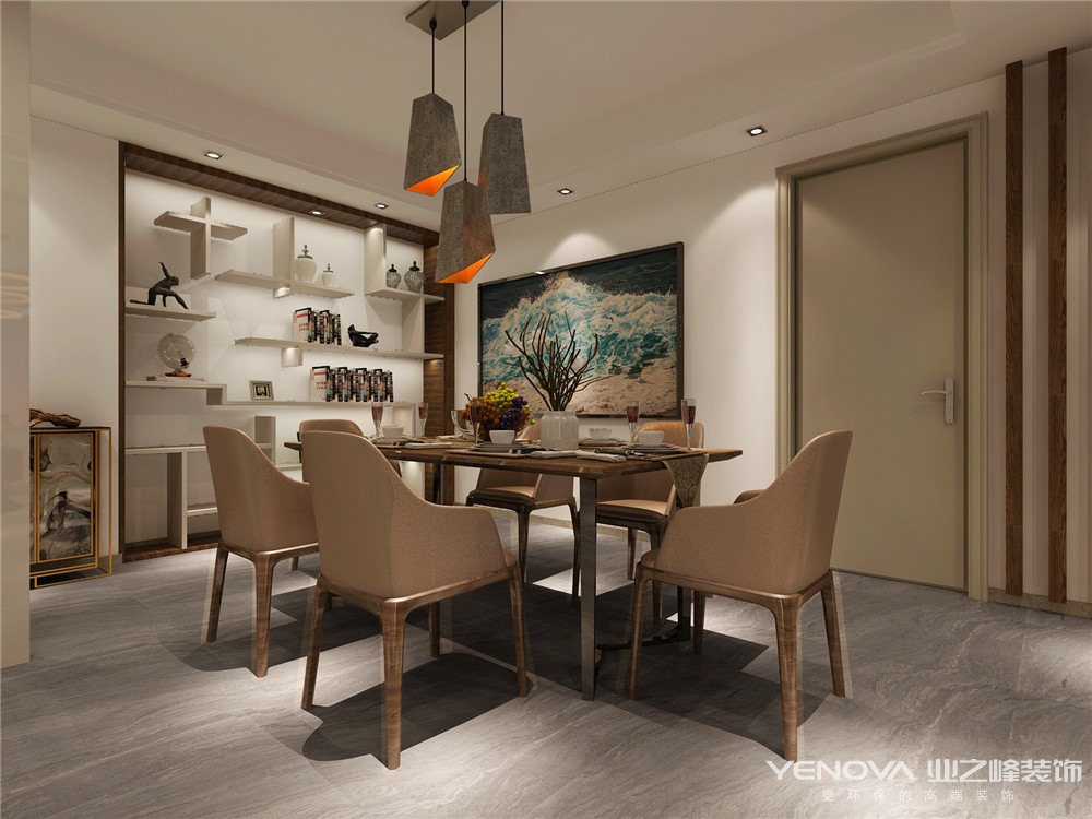 此户型比较方正,风格为北欧风格,北欧风标志性的灰色的沙发搭配圆形的茶几,墙面用装饰画做了点缀,北欧气息很浓郁。灰色的地毯显得舒适柔软,在阳光的照射下,室内显得温暖明媚,室内的挂画根据家里墙面和家具的长度而定。沙发上的条纹抱枕增加了空间的舒适度,沙发边上的轻巧的茶几方便移动,满足了日常的需求,而且颜值很很高。工业风的吊灯设计感十足,配上四把简约的椅子,餐厅空间简单雅致,墙面用油画做了渲染,整体色调很统一。
