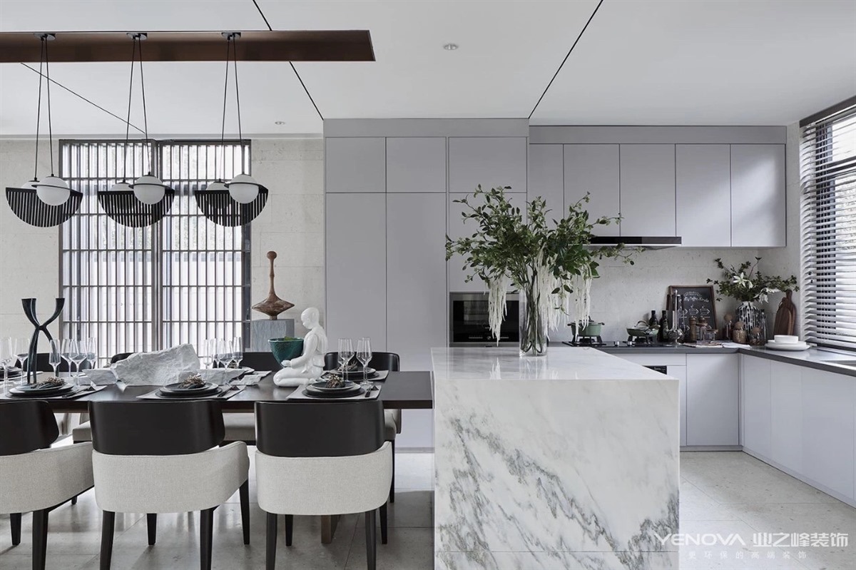 贝金米黄大理石温润而遒劲,有着隐约可见的自然肌理,铺垫墨色山水般的空间基调。一尊深色的墙壁挂件成为点睛之笔,抽象主义的轮廓蕴含柔性的力量,与散落于空间各处的陈设装置构成连续性的后现代混搭艺术。