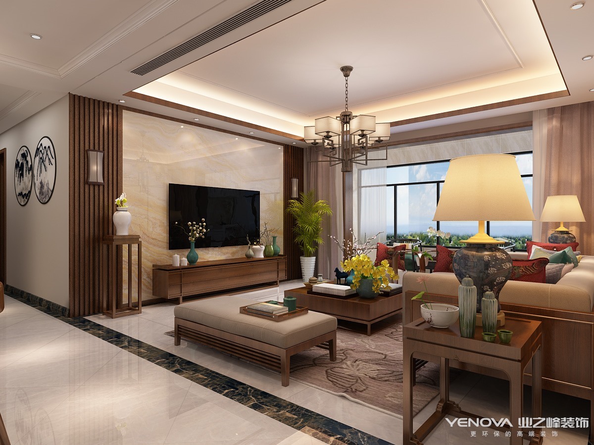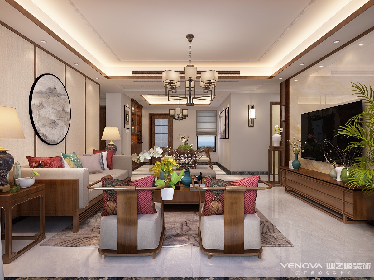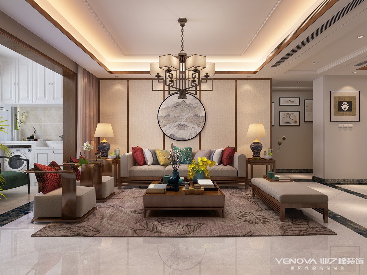 新中式风格讲究纲常,讲究对称,以阴阳平衡概念调和室内生态。选用天然的装饰材料,运用“金、木、水、火、土”五种元素的组合规律来营造禅宗式的理性和宁静环境。