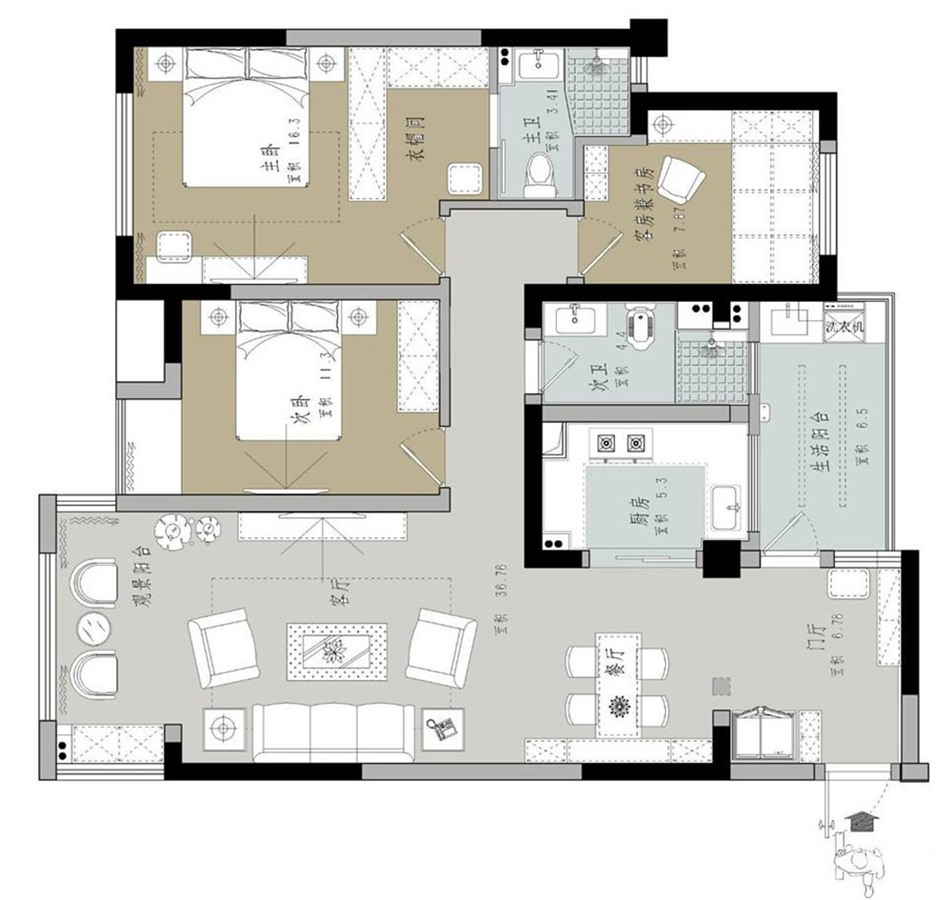 本方案为三房两厅两卫一厨的多层住宅,室内使用面积116平方米,设计风格定向为现代简约风格,采用多元化、时尚极简文化,在“极简主义”当道的今天 以简洁的表现形式来满足人们对空间环境那种感性的、本能的和理性的需求,简洁明快的简约主义。室内户型方正,主卧空间面积大利用率高,通风采光好。以客户要求的“大空间、大体块、大格局” 为前提追求极致的舒适度与奢侈度。在软装上围绕着现代、简约这两个主题进行整体软装配饰设计