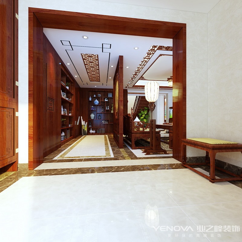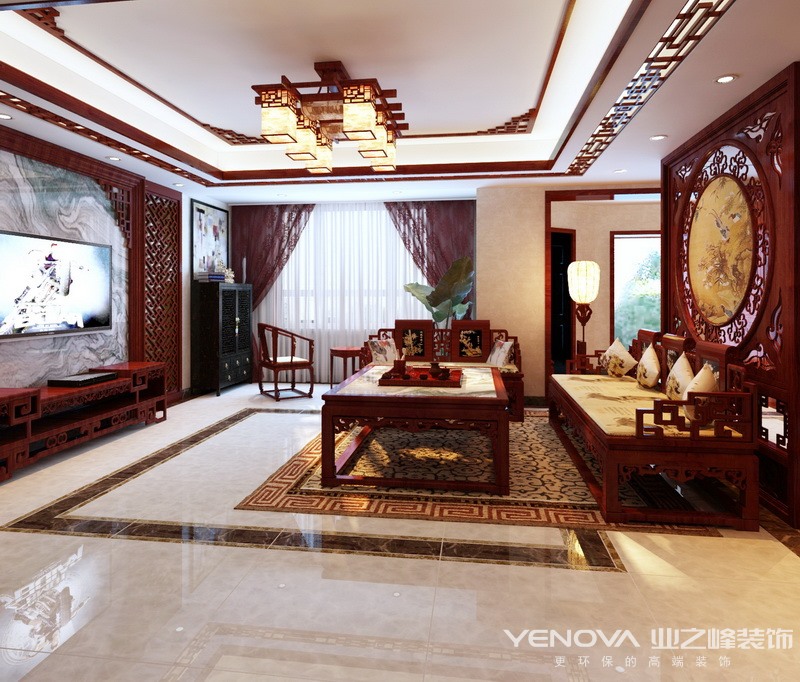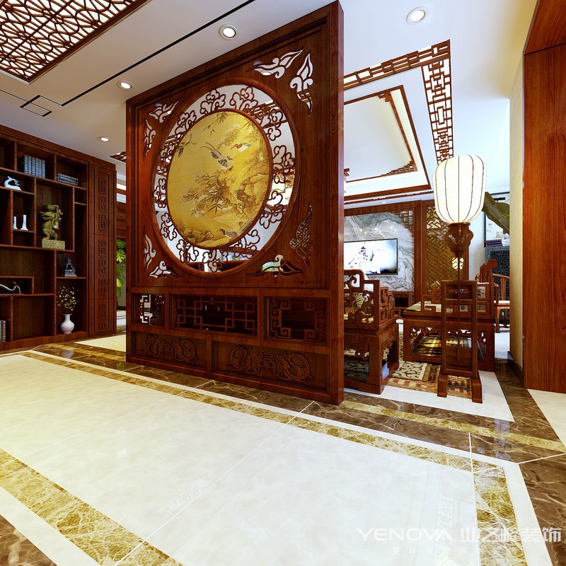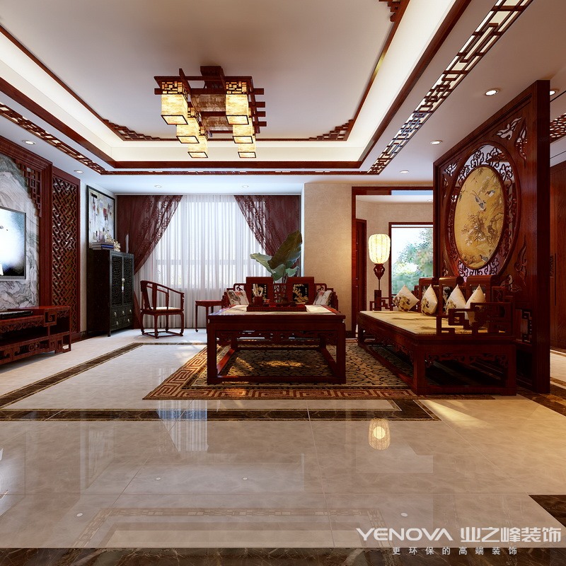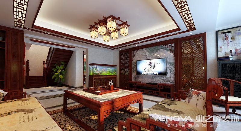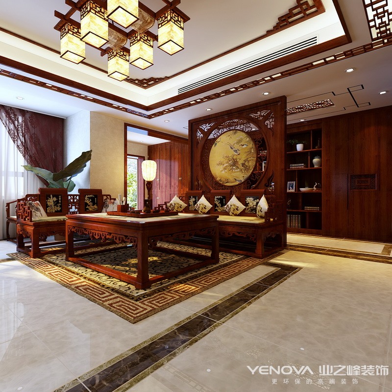 本案客户夫妻两个喜欢中国的传统文化,中式风格的室内设计艺术气势恢弘,讲究对称,色彩沉稳大气。此空间客厅东西较长一些,而且去一楼小院也得从客厅通过,所以在客厅空间的划分上,设计师通过一个大气的屏风隔断巧妙的解决了。