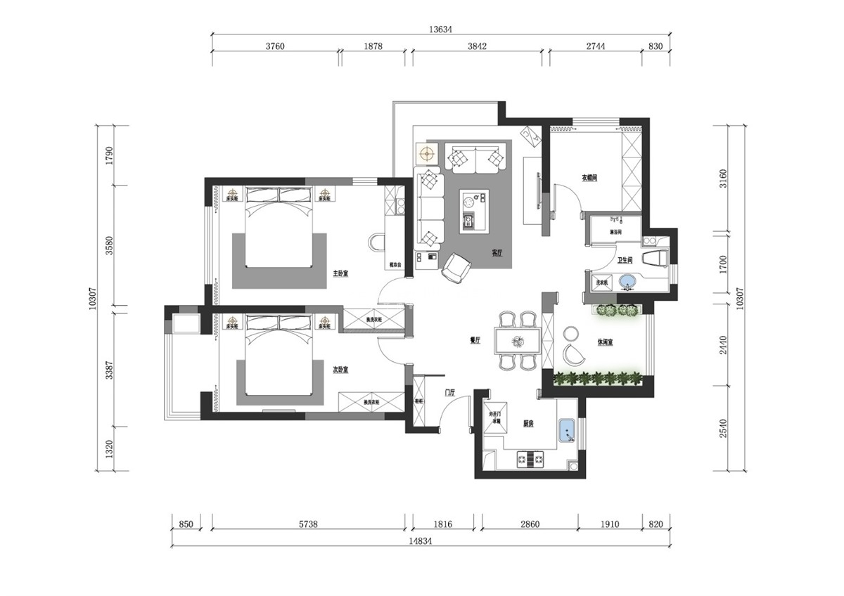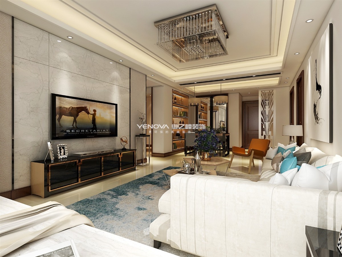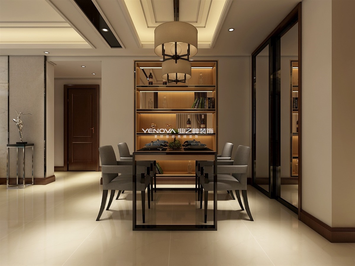 本案主人希望在简约的基础上兼顾一些精致的质感,没有过多繁杂装饰的设计,使整个空间都充满了现代感,在整体色彩的选择上采用沉稳低调的灰与棕,大理石背景墙和精致的灯饰都成了点睛之笔。冷色调与暖色调的搭配调和,为空间披上端庄素雅的轻纱。餐厅部分通过嵌入式柜子的巧妙设计增加了一定的收纳空间。休闲室的设计更是对大自然最好的敬畏,回归本源,以朴实的自然木色为主色调,大面积留白与之形成呼应,安静婉约、温馨而舒朗。