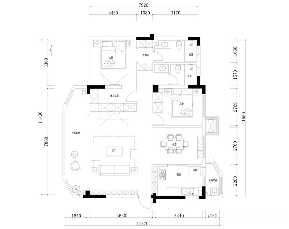 小区:香堤荣府 面积:135㎡ 户型:二居 风格:混搭风格