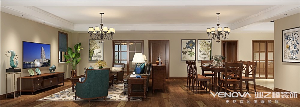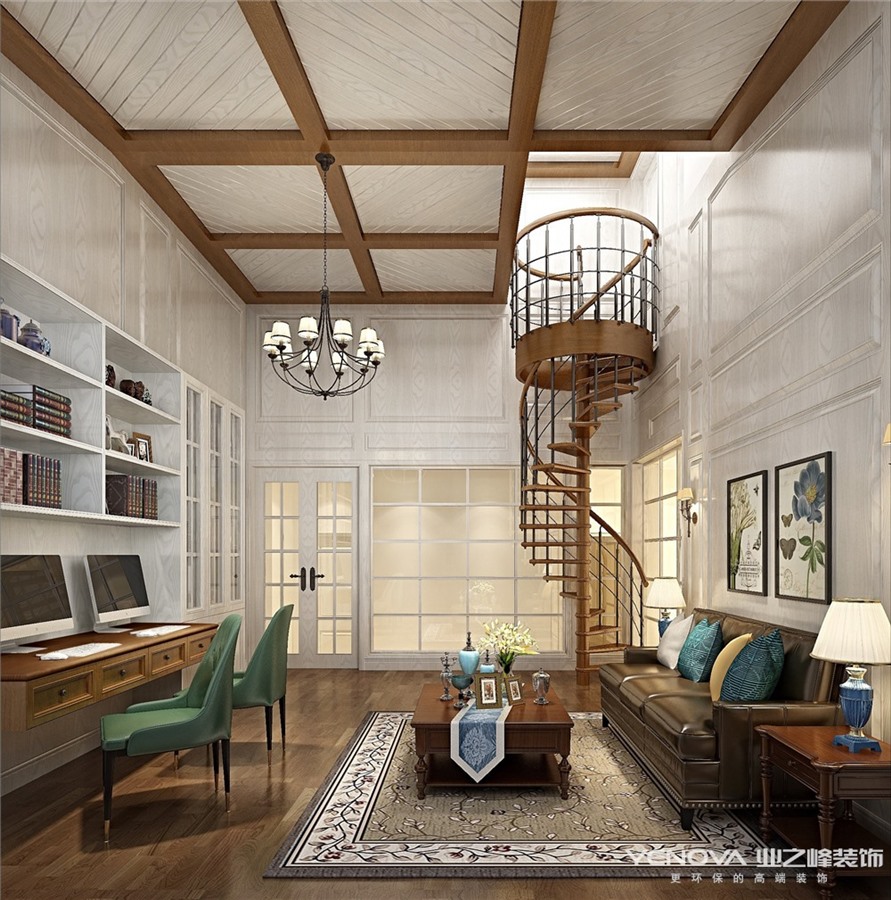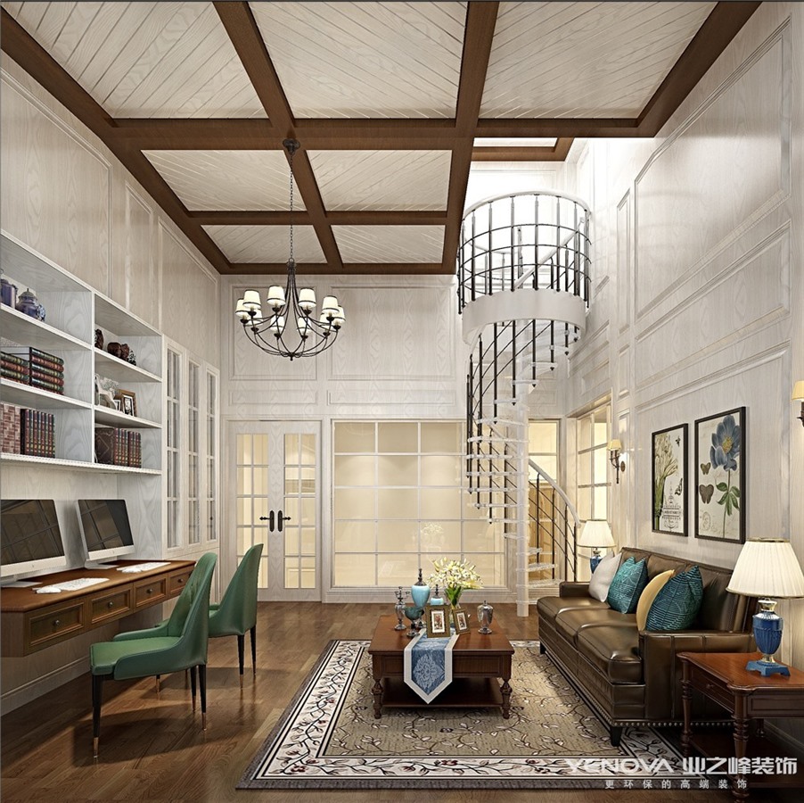 此设计方案风格定位为美式风格。本案的设计重点是大气,业主对书房的要求非常的高,所以我们这次的设计重点在书房.顶面我们采用了木质假梁来完成,整个书房墙面使用墙板,门和窗户采用了田子玻璃,营造出一种乡村美式的感觉,让人在工作之余能够等到视觉上的一个放松.整个设计的色彩搭配用深胡桃色搭配浅色系,完成了色彩上的一个跳跃,看着非常的大气.