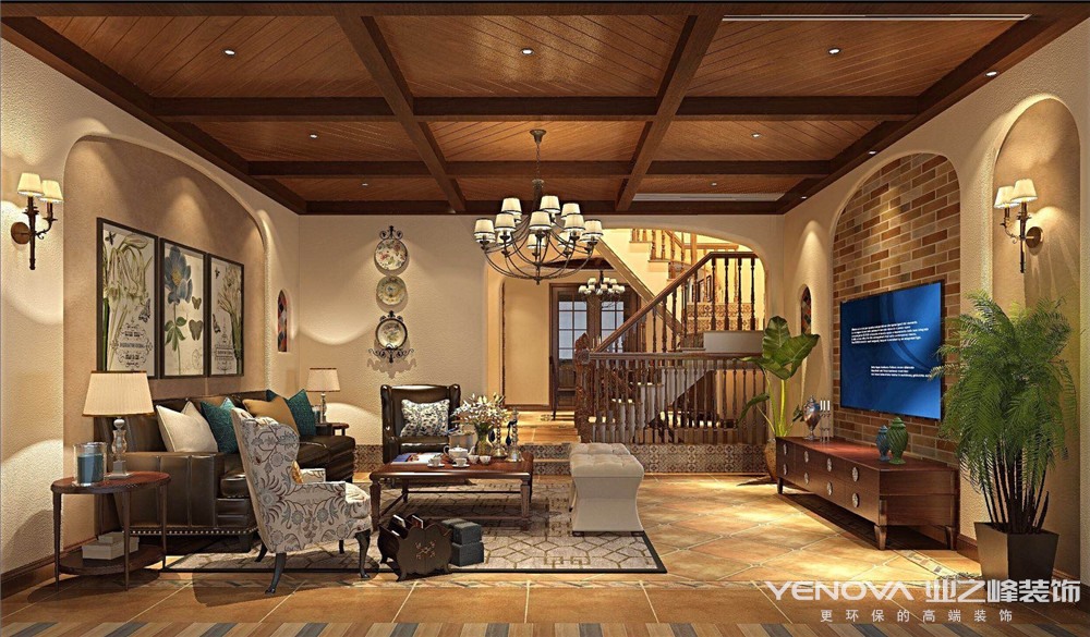 此设计方案风格定位为地中海美式。本案的设计重点是地中海的洒脱感,我们在客厅的墙面设计上以弧形造型为主,加上风格不同的壁纸以及挂画,营造出地中海的感觉,给人一种身在异国的感觉,顶面设计上运用到了木质假梁,使在整个空间更加的富有层次感,色彩方面我们家具以深胡桃木为主,墙面配以同色调的浅色,在软装上搭配一些跳跃的颜色,使得整个色彩视觉上稳重的同时又不失趣味.