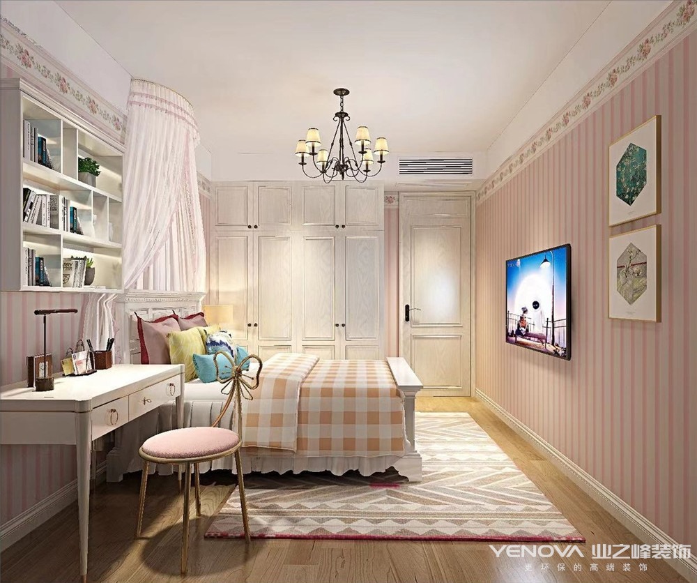 此设计方案风格定位为美式风格。本案的设计重点是温馨,在色彩搭配上我们采用了深胡桃木色搭配浅色系,让整个空间更加有层次感,在此次方案中我们也做到了一个区域的划分,整个儿童房采取了与主卧室及客餐厅不一样的粉色调,完全满足了小朋友粉粉嫩嫩的少女心,做到了一屋多样化,让每一个家庭成员在各自的区域里都能有一个更放松的状态.