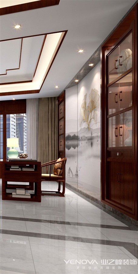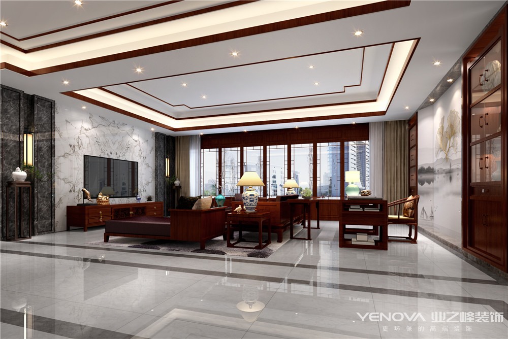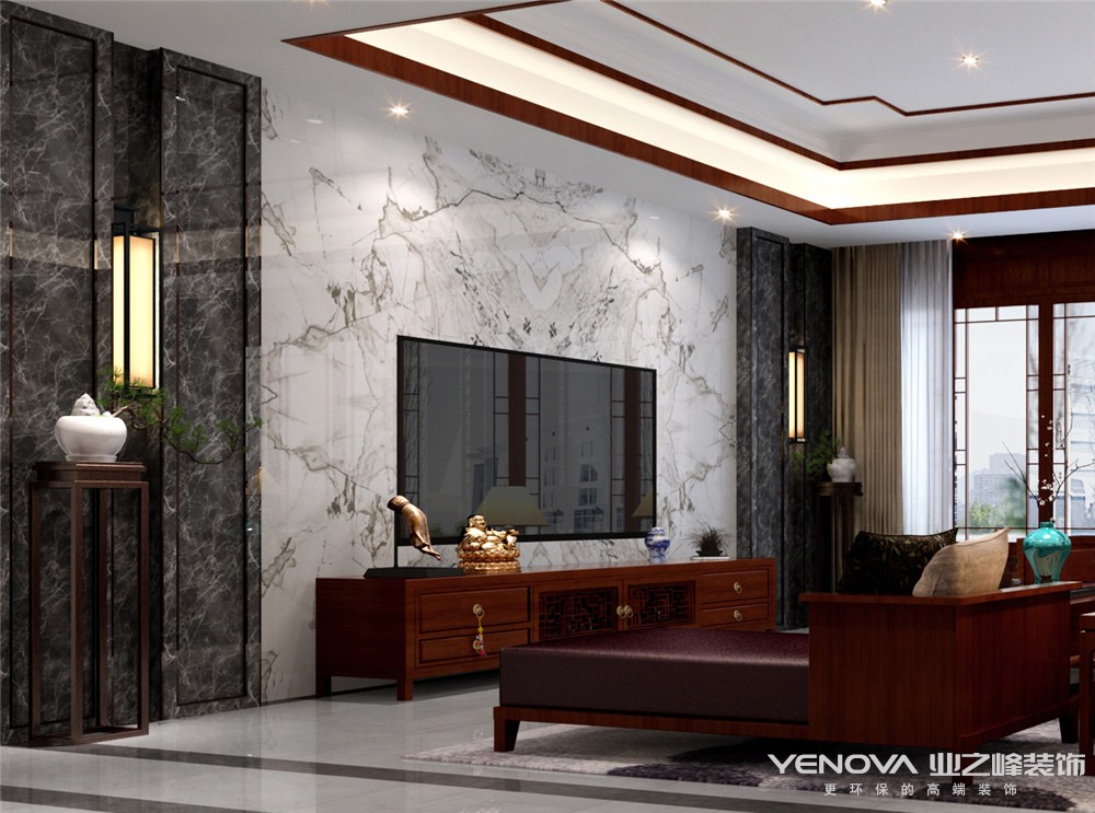 设计中用新中式方式体现了温和、淡雅、舒适、闲适的风格。木质材料使用较多,花梨木和紫檀色为主要颜色,整体的色调较为的清新淡雅。电视背景墙天然石材黑与白恰到好处拼接,给人一种中国文化稳重,内敛。同时使人视线得到扩展、放松,更是保留一份遐想空间,与水墨画作相交映,仿佛一瞬间置身于独特的想象空间