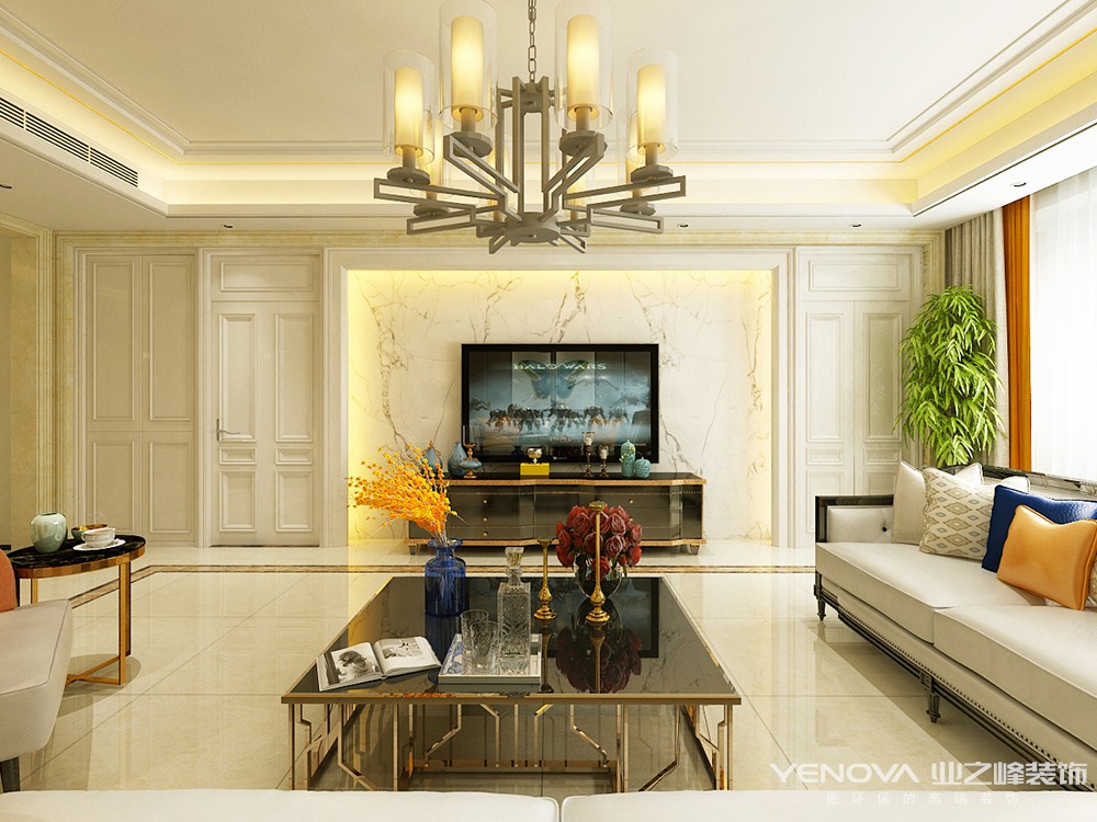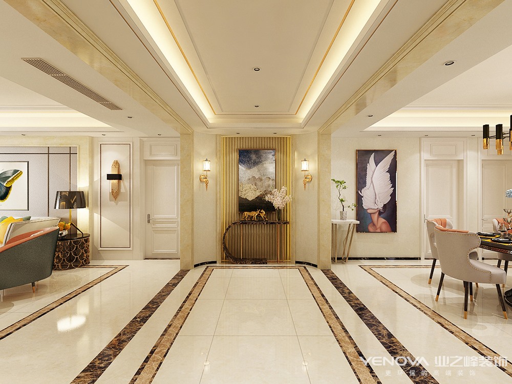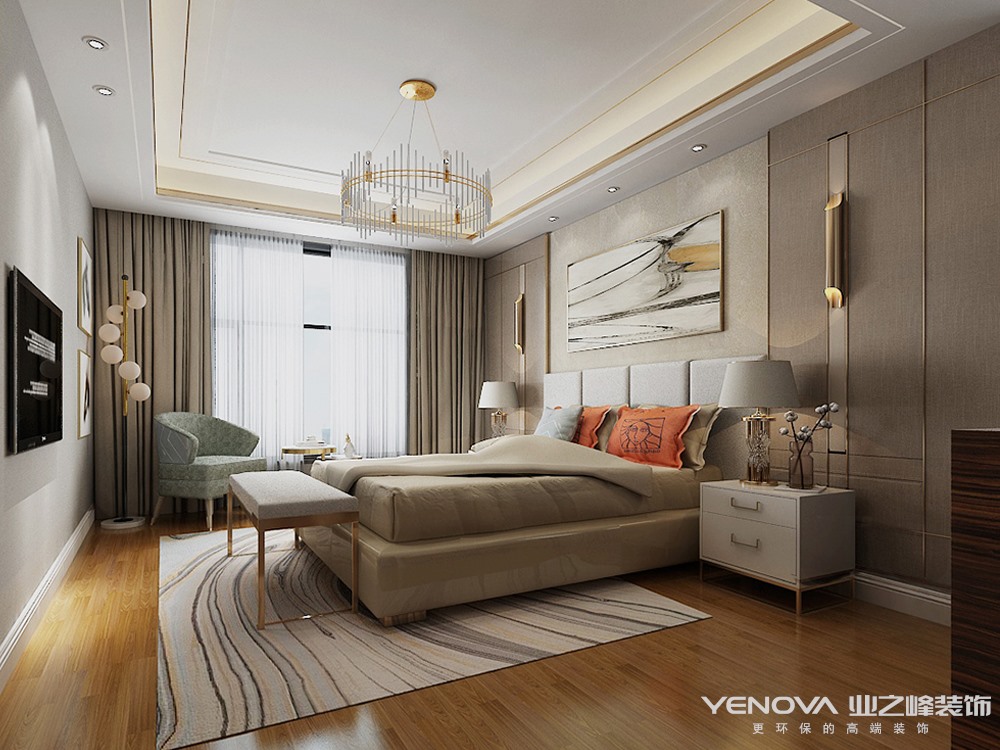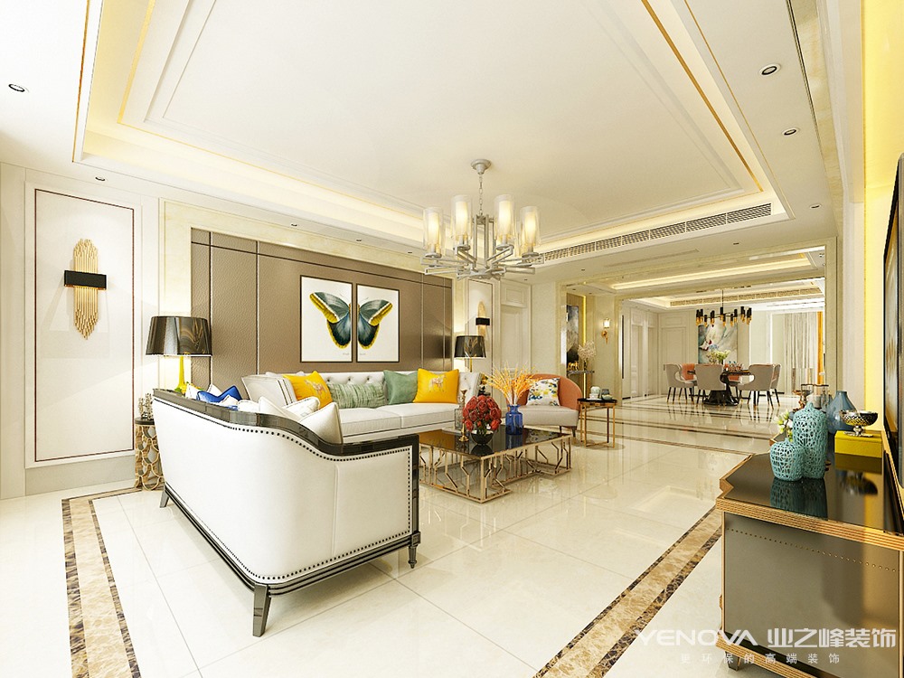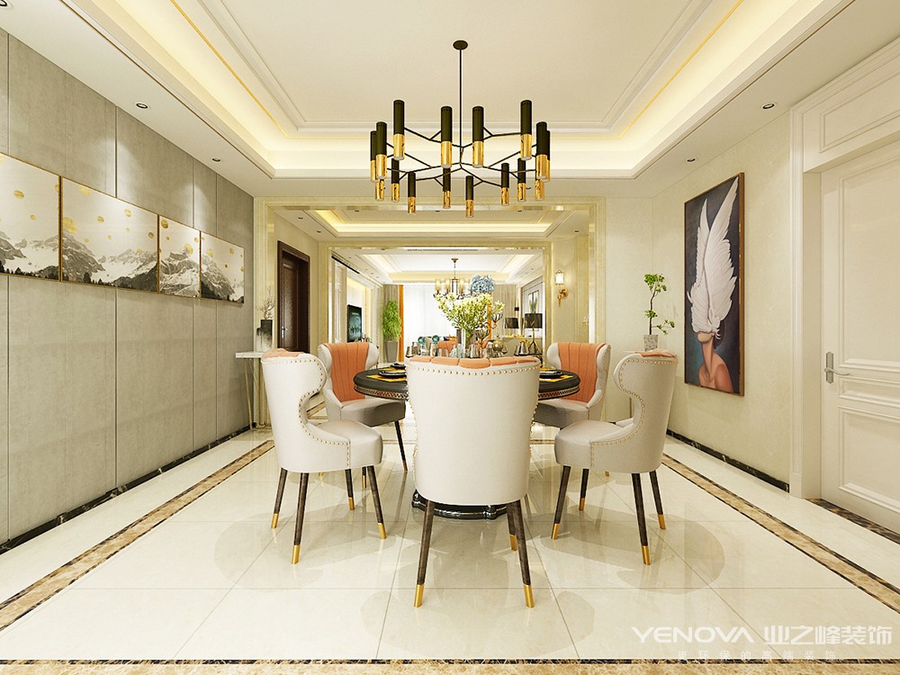 本套方案为现代轻奢风格。客餐厅的空间通透、敞亮,所以在公共空间采用设计了很多亮点。电视背景墙采用暖白色的墙板搭配透亮的石材,既不繁杂又耐人寻味,搭配上顶部照射下来的灯光,提升了客厅的档次。沙发背景墙做了硬包处理,暖咖色的硬包上蝴蝶翩然,白色墙板镶嵌金属边条,优雅大气。简洁和实用既是现代简约风格的基本特点。