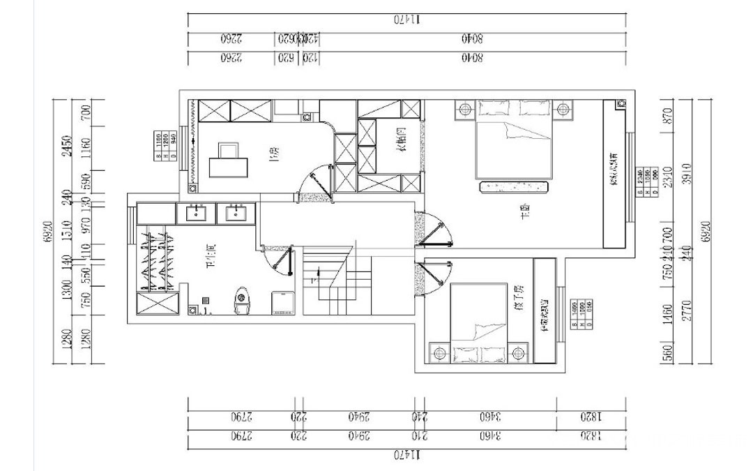改造方案:二楼主卫墙体改造增加书房的面积,增加衣帽间的设计,以增加储物功能。