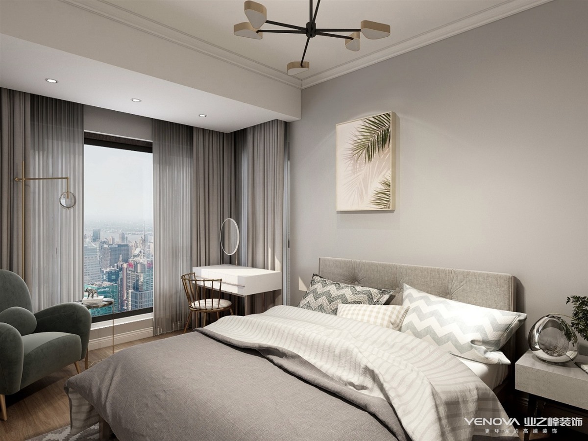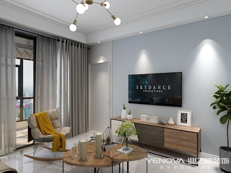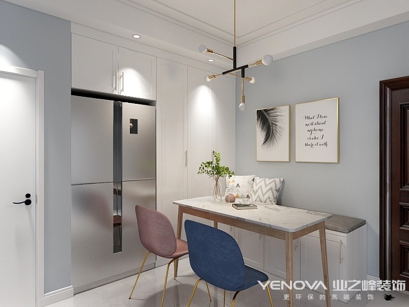 因为屋主喜欢北欧风格,由于局部采光问题,在整体的色调上浅色偏多,主色调是灰蓝和米灰,比较清新,再用暖色调软装点缀,又给空间增添了温馨的感觉。