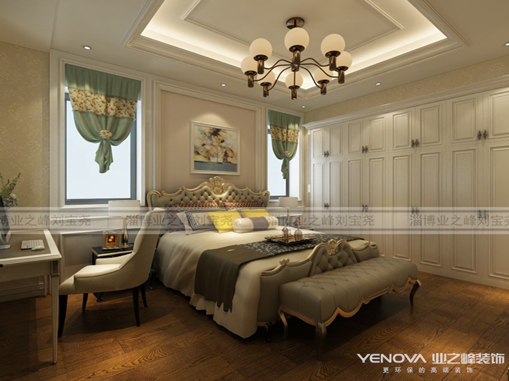 欧式风格的要旨就是用现代的手法和材质还原古典精神,同时具备古典与现代的双重审美效果,古与今完美的结合也让人们在享受物质文明的同时得到了精神上的慰藉。本案的设计师用新古典来诠释这一具有人文精神的传承无疑造就了一个经典脉络的延续和更新,处处闪现着文化的底蕴和魅力。本案是古典和时尚的碰撞和相遇,爱奥尼克式的罗马柱、体现西方天人感应精神的堆砌壁炉、讴歌光明和爱的银质感五枝烛台、大面积的米黄和网纹大理石,以及实木质感的的家具、抽象的装饰画完美地融合在了一起,彰显潜在业主作为拥有国际化视野的社会精英人士的眼光和品位。设计中力求营造出一种使空间尽情挥洒源远流长的神韵,在给予空间生命力的同时也饱含文化情趣。运用了护墙板、天然石材、软包造型等等来凸显欧式的精致和高贵。本案搭配了水晶的灯光、欧式家具、挂画、精致饰品等完美组合,形成了极具品味的装饰效果,将奢华的欧式风情演绎的淋漓尽致。而卧室的设计不只是豪华大气,更多的是惬意和浪漫。整体给人一种舒适温馨的家的感觉。