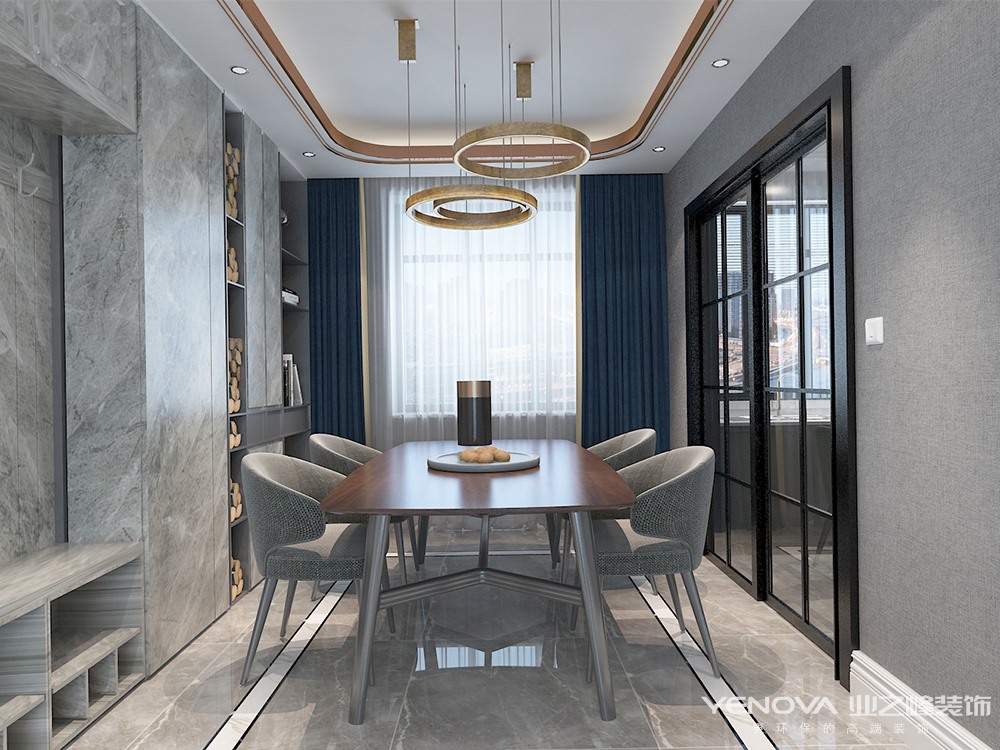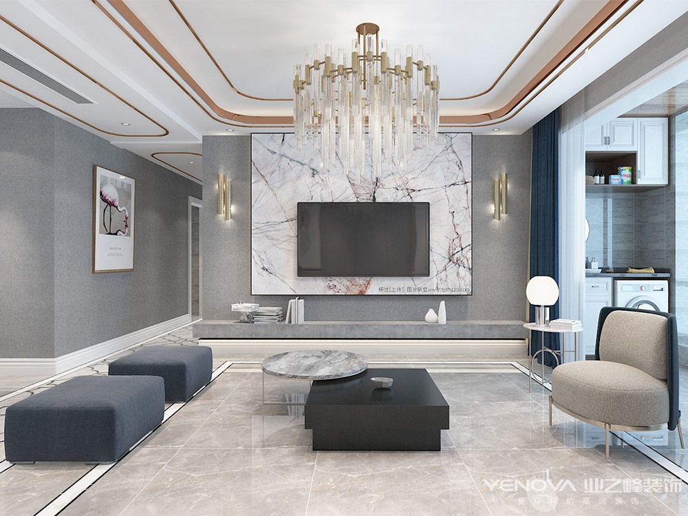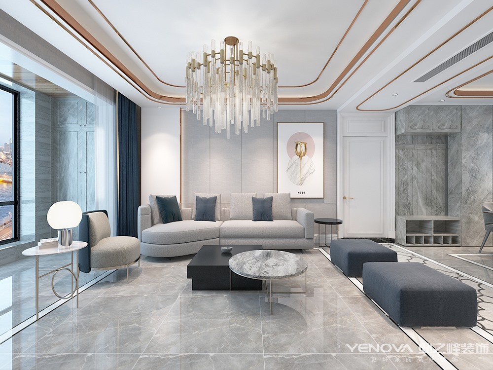 本套方案为现代轻奢风格,通过空间布局上的合理运用,本案整体风格简介明快注重室内空间的使用功能,主张废弃繁琐的装饰,室内布置按功能区分的原则进行,家具布置与空间密切配合,色彩造型紧跟时尚潮流,以个性化简单化装修方式给业主打造舒适家居。客厅的设计上阳台窗户为落地玻璃窗,在视觉上即突显空间又能够有很好的采光。家具上以黑白灰色调以及金属元素的点缀,营造沉稳又不失时尚的氛围,同时与完美的软装相结合,给人全新的体验,在吊顶上采用金属条镶嵌时尚大气的外观造型和地板的拼花工艺,家具上以黑白灰色调以及金属元素的点缀,充分彰显主人高尚的生活品味。色彩上运用时下最流行的金属色调与光感呼应;米杏色、黑白几何,高傲中带点忧郁的“雾霾蓝”,作为主基调搭配黄铜饰品的金属感古堡灰大理石,跳跃零星几抹赭石色;给空间带来视觉上的层次感。
