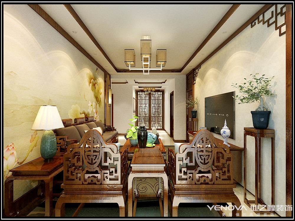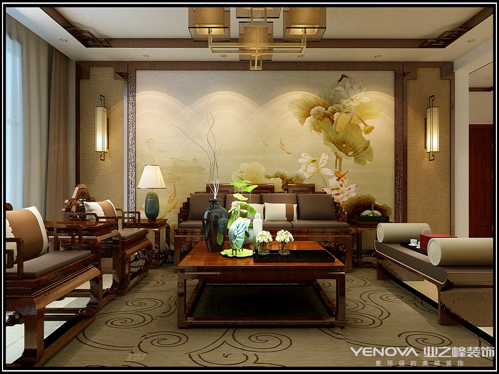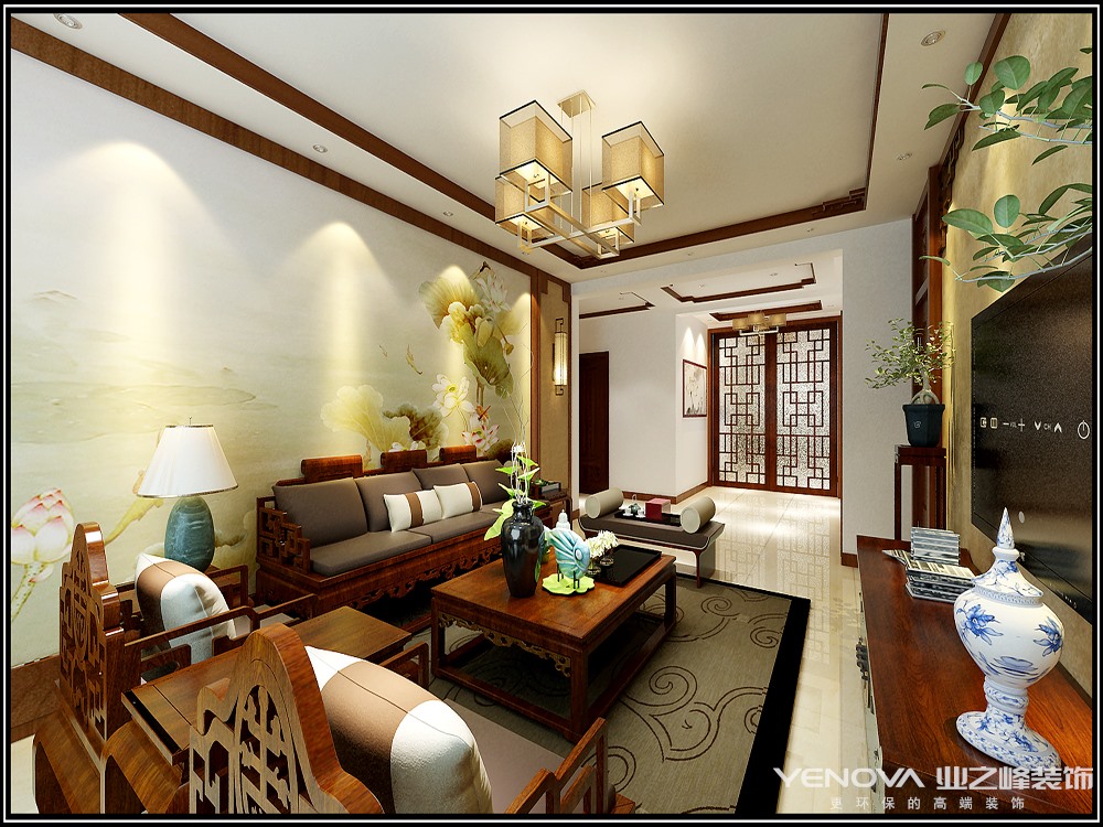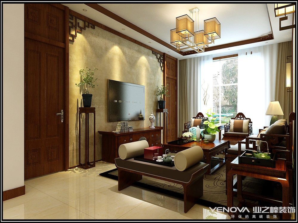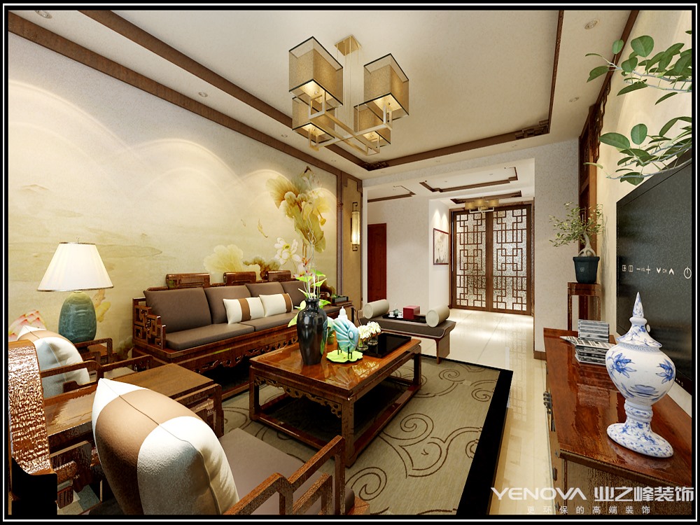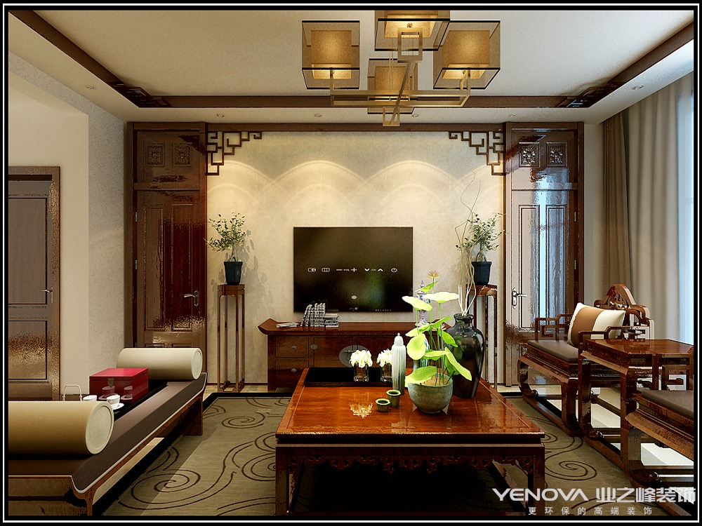本案在家居布局上讲究方正、对称的布局形式,讲究整体的布局和风水格调高雅,造型朴素优美,色彩浓厚而成熟。中式风格的装饰主要体现在传统的家具,再辅以字画、盆景,陶瓷等装饰品,追求的是一种修身、齐家的生活境界。在整体的色彩选择上以庄重的原木色