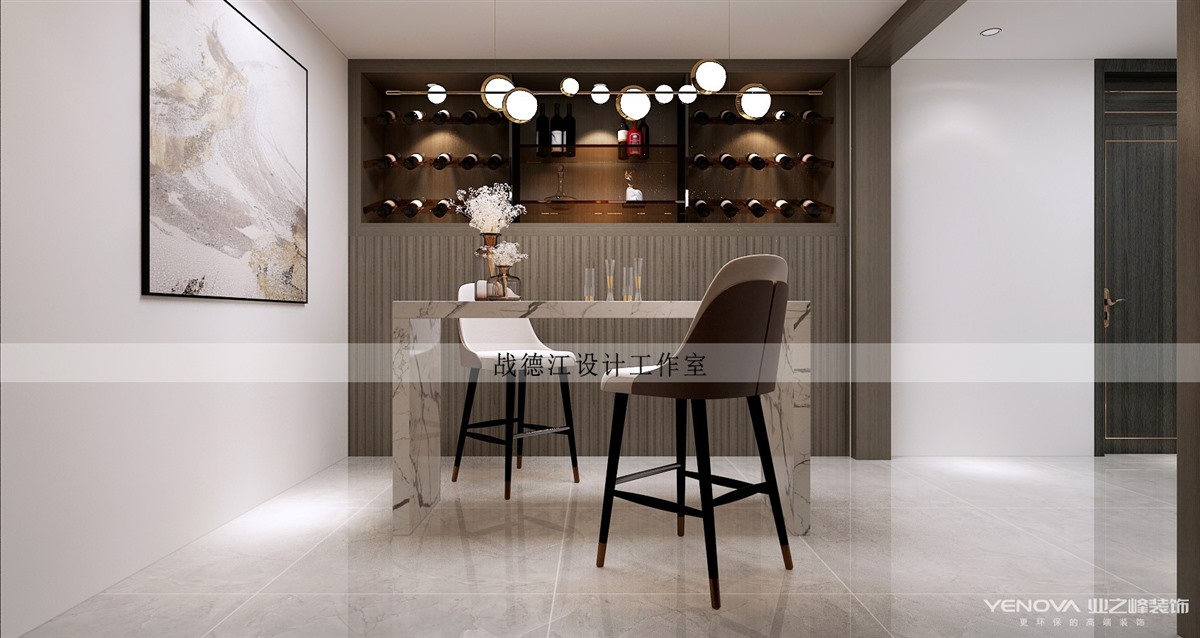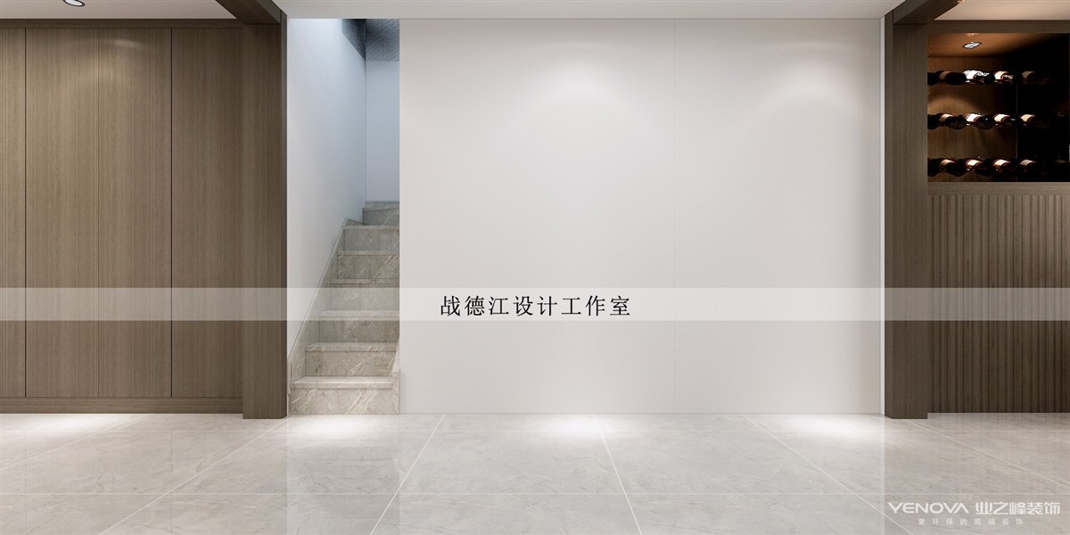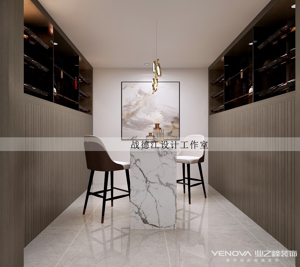 本案为新中式风格设计,室内延续并发扬建筑新中式的风格,以沉稳、内敛的传统文化为基点,为增强别墅大气的空间感,统一采取深色木饰面,沉着内敛的浅灰色铺设地面,在高贵与亲和间自然过渡。整个住宅空间分为地下一层地上三层,负一层作为藏酒区和休闲区;一层为主要为普通社交、餐厨和客厅;二层分为开放式书房、男孩房和女孩房;顶层是主人房为核心的起居空间。中国传统文化中,山的存在一向备受推崇,临山而居是每个人的向往。静隐归心
