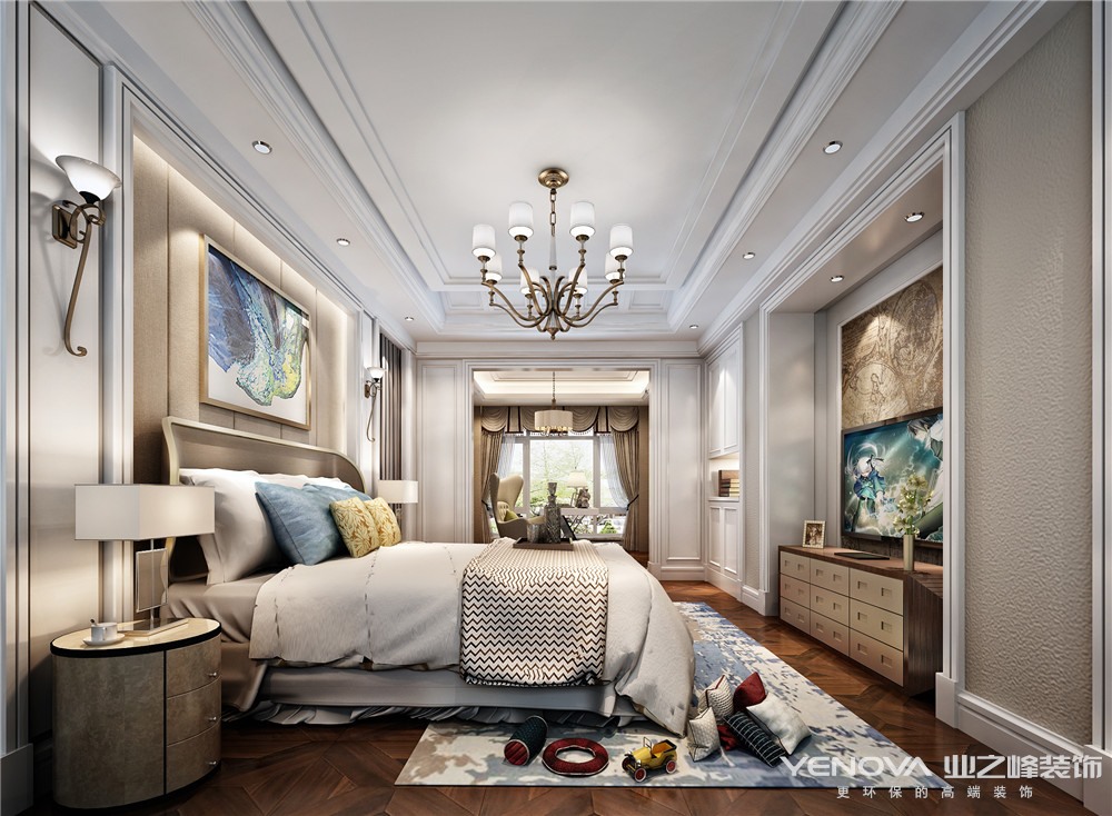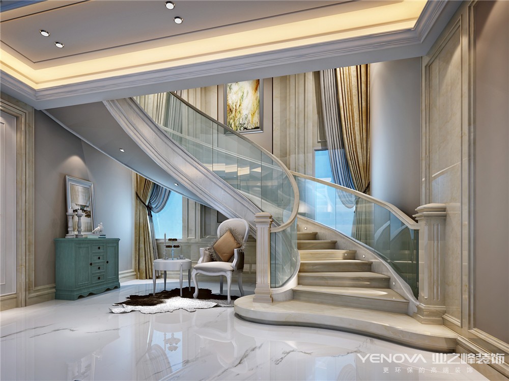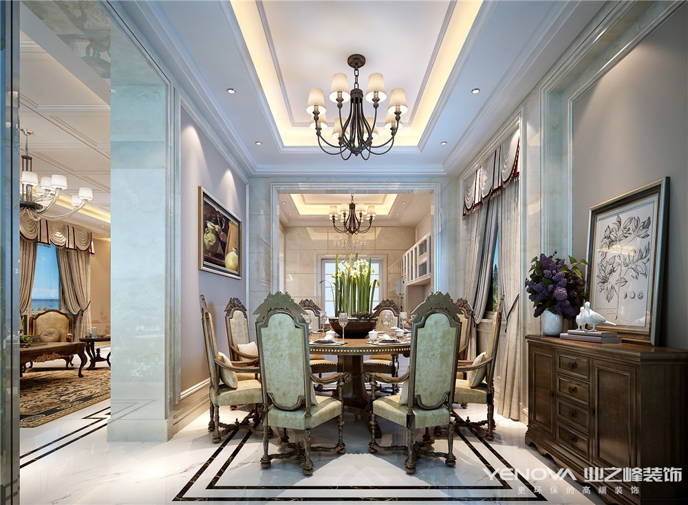 欧式风格以往给我们的都是奢华、富贵的印象,从某种程度上来说也是一种身份和社会地位以及个品位的象征,这一次没有那么富丽堂皇的色彩,倒是显得有点轻奢时尚。客厅整体以白色调为主,融入大量的轻奢风色调。沙发墙用的是灰色调复古墙纸,电视墙并不算真正意义的电视墙,做了欧式浮雕设计,中间主墙放上壁炉,两边使用石膏线条进行装饰,再放置壁灯用于打光和装饰。上部颜色较浅,下部颜色较重,导致重心在地面,符合人们的正常精神需求。简单的线条的叠加,使之逐渐变得复杂多变,也正是因为如此,图案看似复杂的同时也简洁干练。