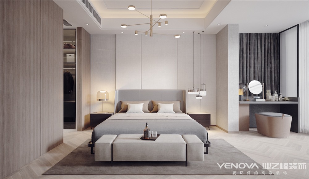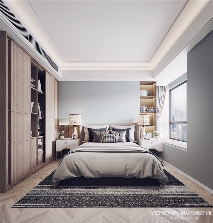 成都业之峰装饰设计案例:设计的过程中,把房间作为一种高雅的想象,刻意避开复杂多样的色彩,使得空间有一种素雅的氛围,为了避免冷漠,从材料的色彩和质地上,特地选择了浅淡的木饰面和地板,使整体的空间氛围显得轻松自在.另一方面,引入灯光增强光线的柔和与暖意。